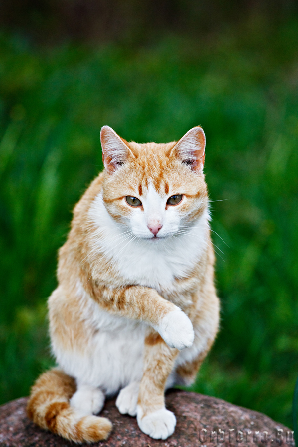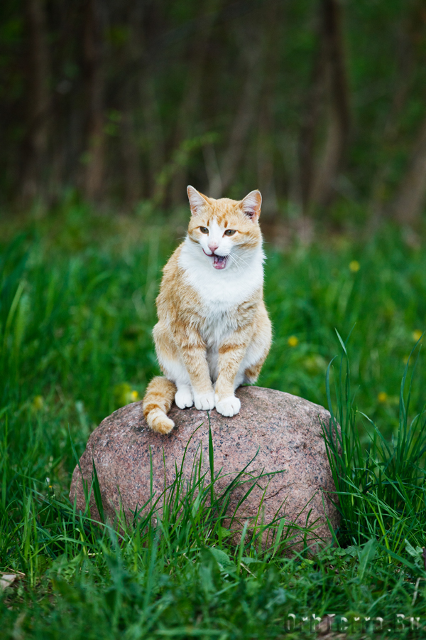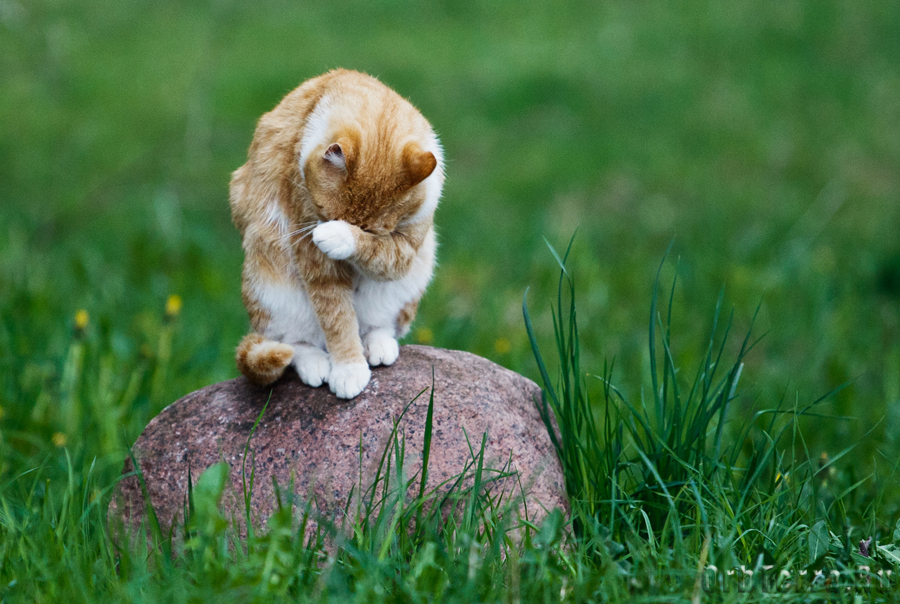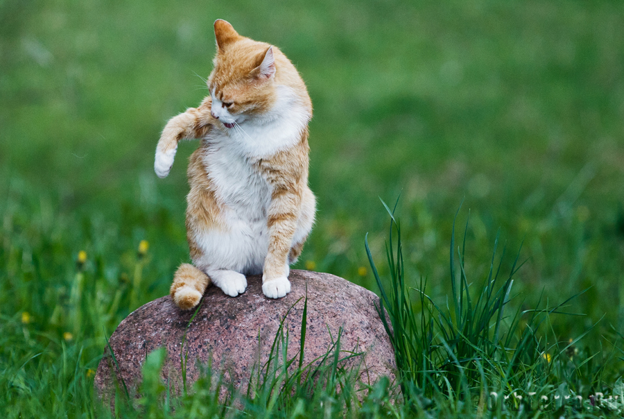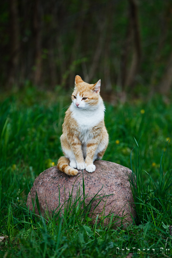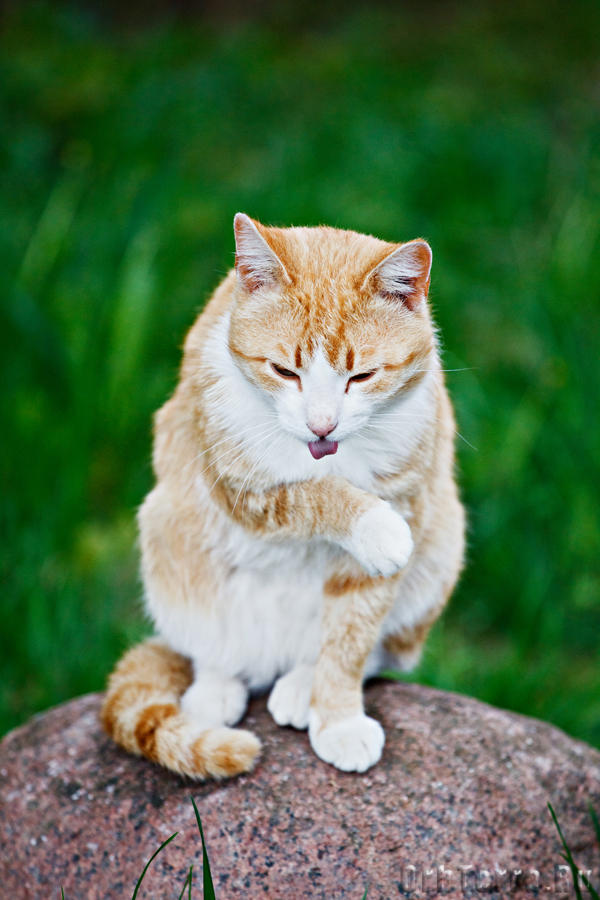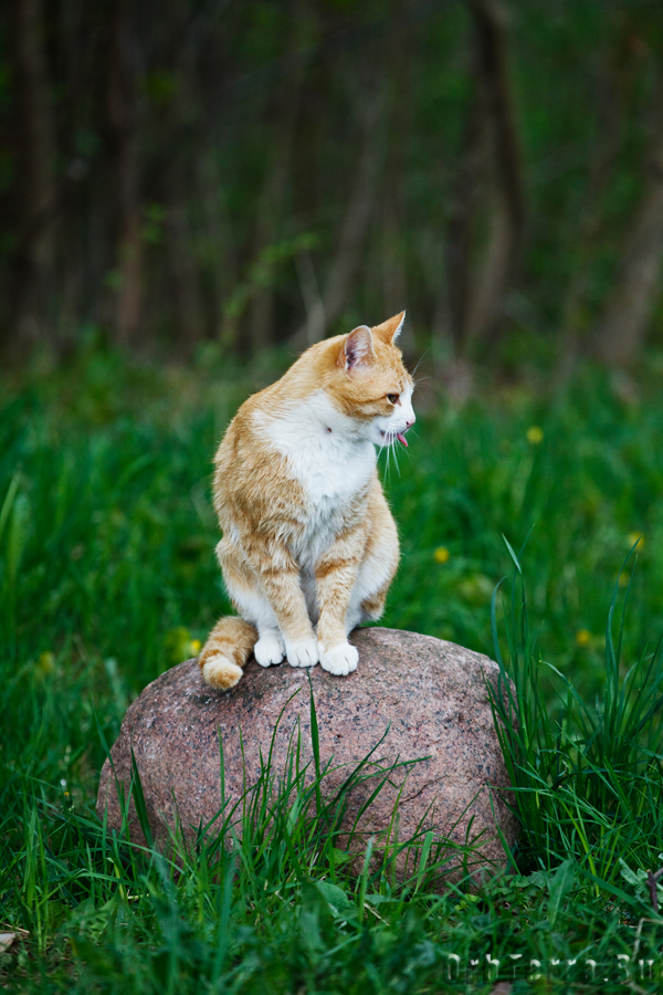 В одном из путешествий по прекрасной Псковской земле, мне встретился рыжий кот. Самый обыкновенный, уличный киска, обитающий в Печерском монастыре. Он сидел на гранитном валуне недалеко от монастырской стены и самозабвенно занимался гигиеной рыже-белой шубки, не забывая при этом наблюдать за окружающей обстановкой, крутя ушами-локаторами на 180 градусов. Естественно наше появление не прошло не замеченным, но каким-то неведомым образом, почувствовав, что мы не несем угрозы, кошак продолжил свое дело с прежней тщательностью, не забывая, однако пристально следить за нашими действиями. Извлечение из рюкзаков фототехники, так же было воспринято совершенно спокойно, и все время, пока мы устраивали ему фотосессию, он продолжал свое дело, как ни в чем не бывало. Временами, даже казалось, что все это действо доставляет ему удовольствие, и он специально позирует. Закончив снимать, мы пошли дальше, а кот, проводив нас взглядом, остался сидеть на камне, топорща усы и по-прежнему крутя ушами-локаторами.
