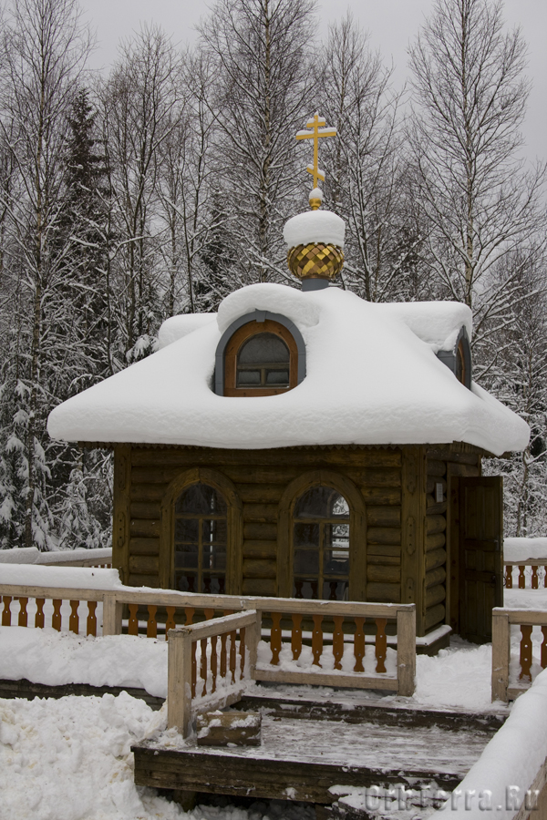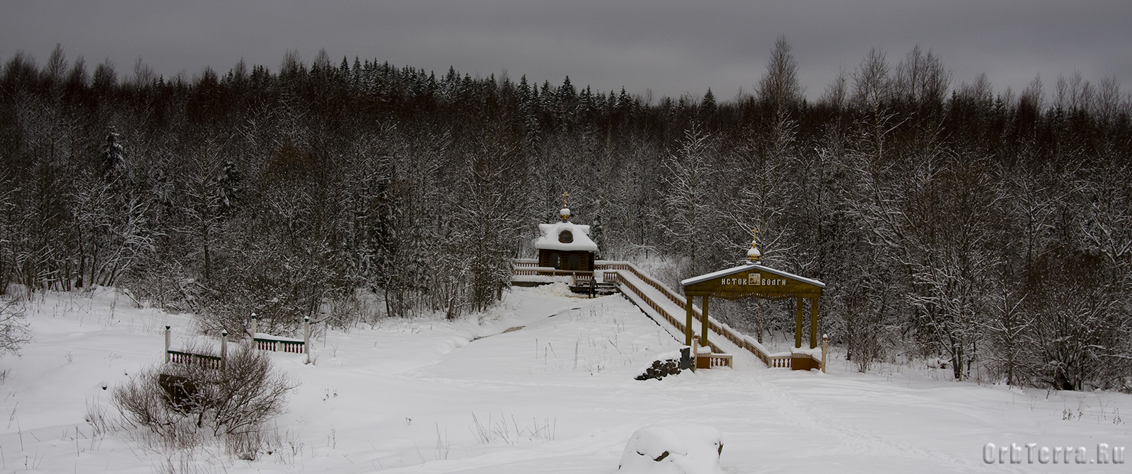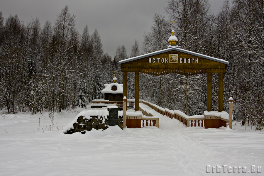 Маленькая часовенка стоящая над истоком, видна сразу от околицы. Правда, спускаться к ней пришлось по скользкой, узенькой тропинке петляющей между сугробами. После недавнего снегопада ее еще не успели протоптать. Перед деревянными мостками ведущими к ней, лежит камень с обращением к паломникам. Вход на мостки украшен деревянной резной аркой. В часовенку можно войти и, присмотревшись, увидеть тихое биение ключа. Этот маленький родничок и есть исток великой русской реки Волги.