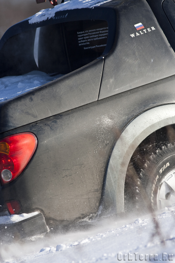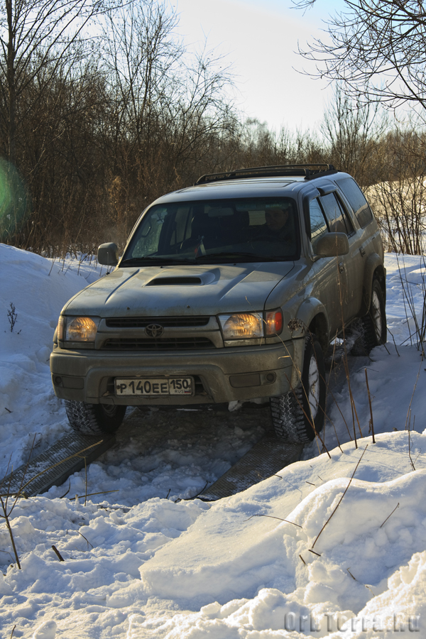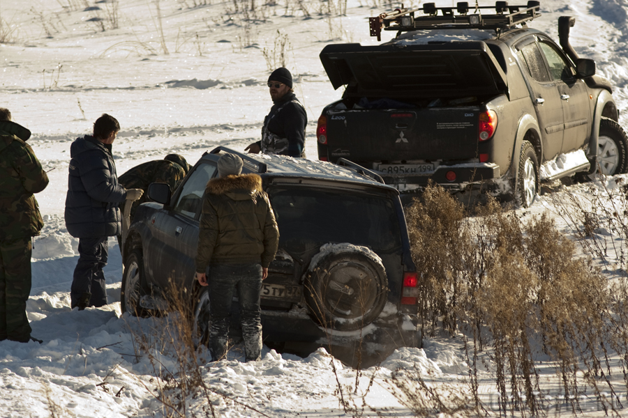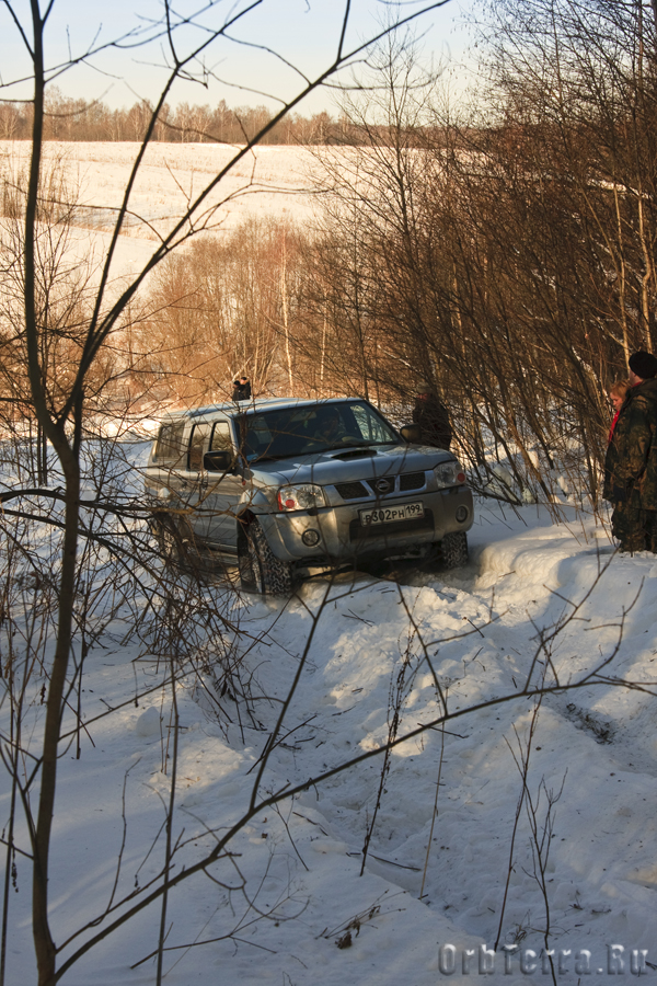 Проехав через деревеньку, съехали в низину к ручью, который прошли без проблем, поскольку свесы у нас значительно меньше чем у пикапов. После ручья начинался самый сложный участок маршрута, подъем в заснеженную гору. Горка сразу не поддалась. Где то чуть выше половины подъема, меня снесло с колеи и пришлось здавать назад, что бы вернуться на колею. После того как меня чуток подтолкнули, мы смогли тронуться и полезли вверх, дальнейший подъем проблем не вызвал.