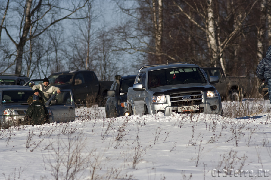 Проехав Старицу, покидаем асфальт и съезжаем в поле. Точка съезда была отмечена группой пикапов, которая посетила пещеру недели за три, до нас. Но так как после этого была оттепель, а потом выпал снег, то от проторенной ими дороги остался только съезд, да трек GPS. Дорогу пробивали заново.