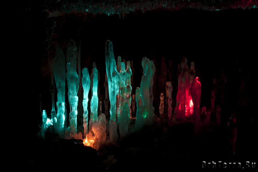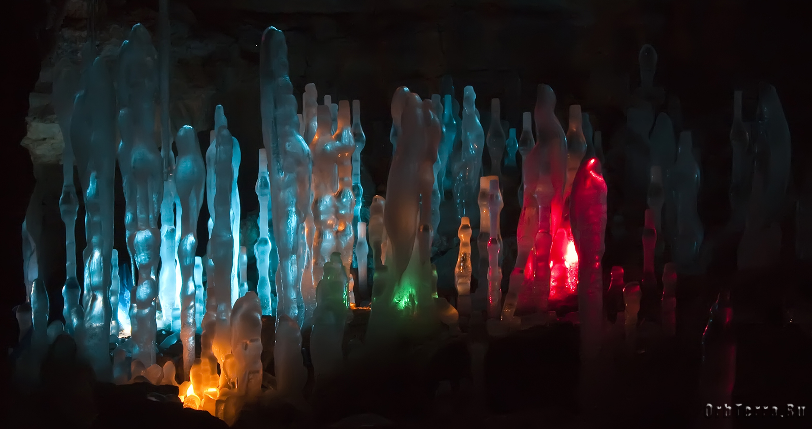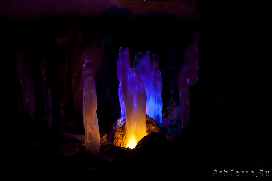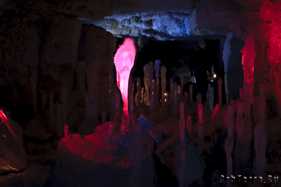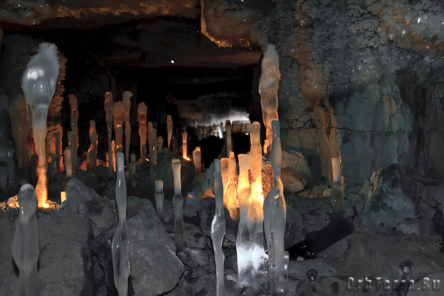 Согнувшись до земли, лезем в низкий и узкий проход и по короткой галерее попадем в сказочное царство ледяных фигур и загадочно мерцающих сводов, которые сплошным ковром покрывают кристаллы льда. Любой снимок сделанный здесь можно считать уникальным. К лету эта сказка растает, чтобы следующей зимой возродиться, рождая новые образы.