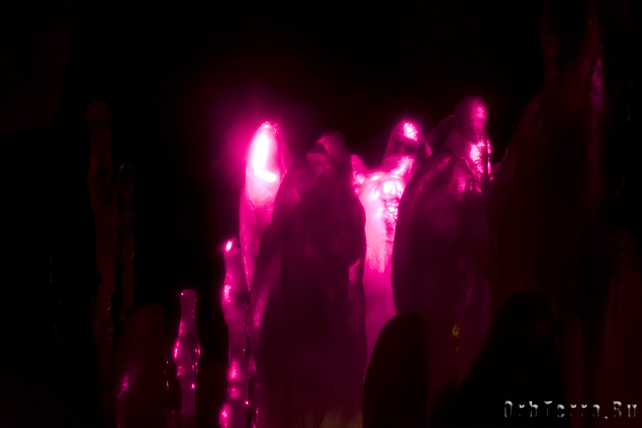 Перед поездкой мы запаслись двумя фонарями с цветными фильтрами и кучей свечей в плошках. Уже в пещере с нами поделились цветной пленкой ребята из клуба, за что им огромное спасибо. Забыв про время, мы со штурманом провели здесь несколько часов, расставляя источники света между камнями и ледяными фигурами, стараясь не подвернуть ноги о первые и не разбить вторые. А когда на поверхности наступил вечер, мы стали свидетелями красивого явления. Пещера начала «парить», видимо теплый воздух из глубины пещеры начало вытягивать на улицу, где температура начала падать с наступлением темноты. В свете наших цветных фонарей расставленных по пещере, пар двигаясь, создавал причудливую игру света и тени среди ледяных скульптур. Создавалось ощущение движения. Ангелы, паломники в плащах, диковинные звери изо льда. Старые каменоломни словно ожили. В этом было что-то мистическое и завораживающее, аж до мурашек по коже.