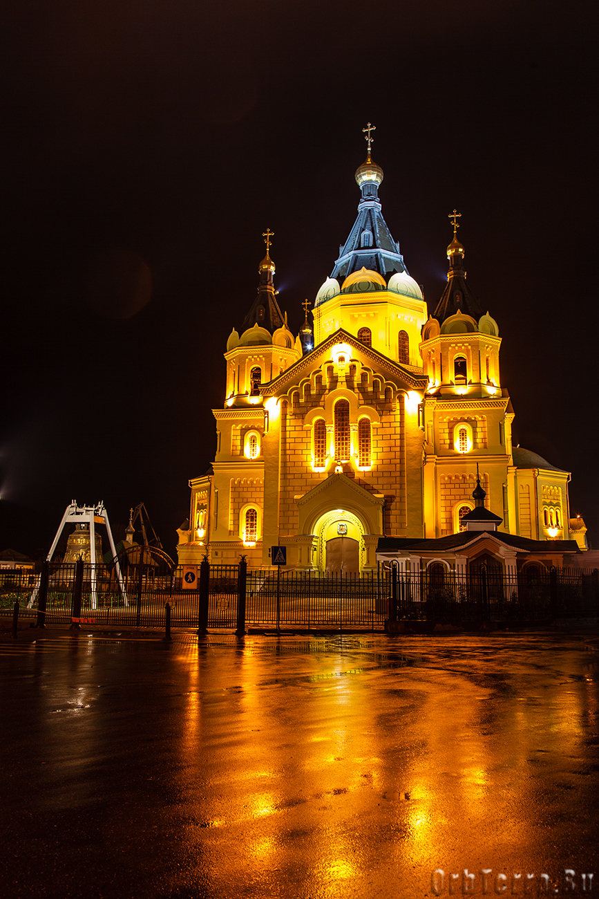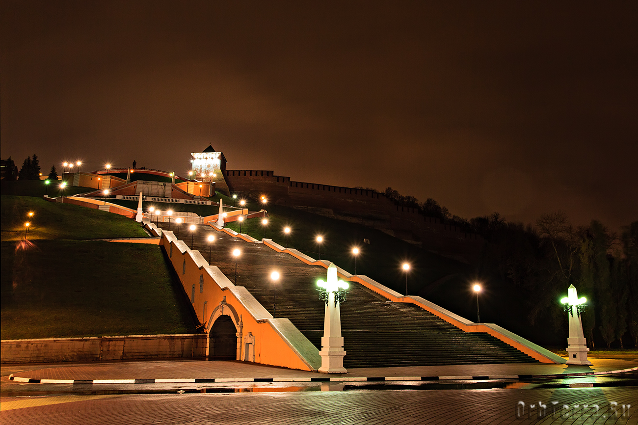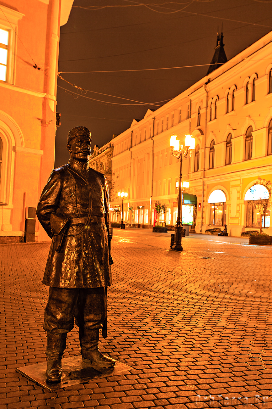 Утро было хмурым и унылым, небо, затянутое серой хмарью облаков и периодически моросящий дождик, не лучшие условия для фотографа. На улицу вообще выходить не хотелось, гораздо уютнее было сидеть в гостиничном кафе и потягивать утренний кофе. Но просидеть весь день в гостинице и не осмотреть хотя бы центр города, было бы непростительной глупостью. Осмотр начали с кремля, крытые боевые ходы крепостных стен которого, хорошо защищают от дождя. А из бойниц открываются красивые виды на город и слияние рек. Потом прошлись по набережной, и изрядно проголодавшись, отправились на Большую Покровскую улицу, место во всех отношениях интересное и замечательное, с красивыми зданиями и оригинальными скульптурами. Пока сидели в одном из уютных ресторанчиков, окончательно окрепла мысль фотографировать ночью, когда унылое серое небо не видно, а мокрые улицы и стены домов отражают свет фонарей и прожекторов подсветки. Жаль только что подсветку имеет лишь малая часть достопримечательностей, в основном хорошо подсвечены только те, что расположены близко к центру города Но все же ночь в Нижнем Новгороде удалась, и мы постараемся вернуться сюда еще раз, а может и не раз. Хотелось бы только погоду получше.