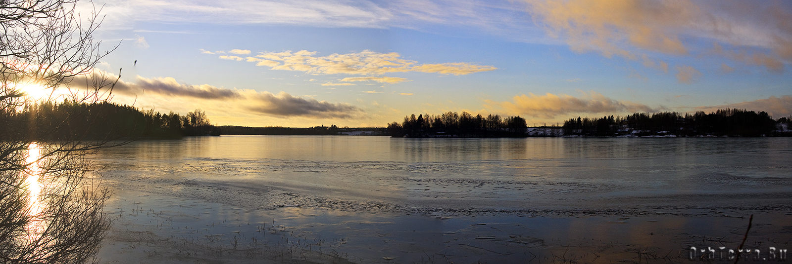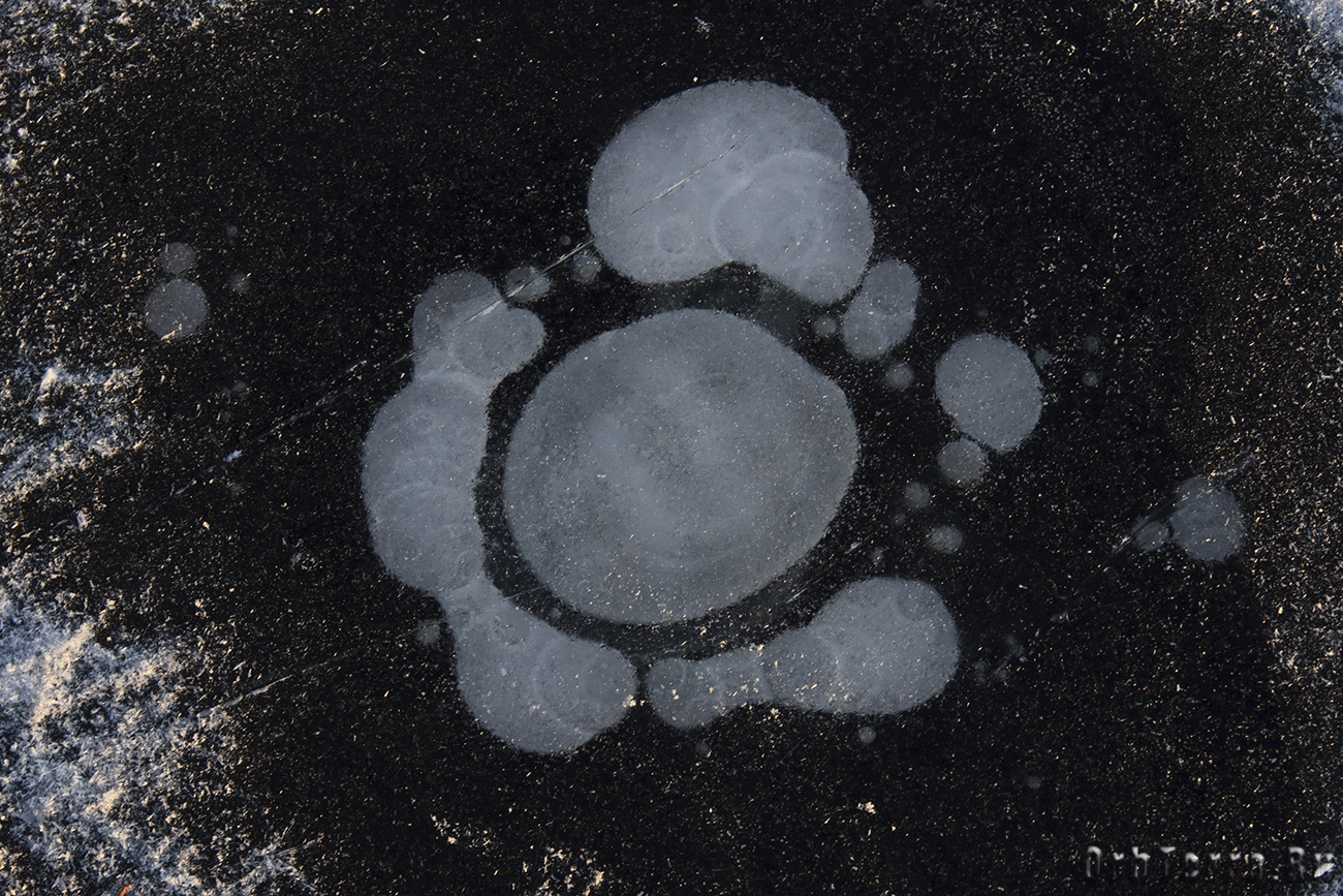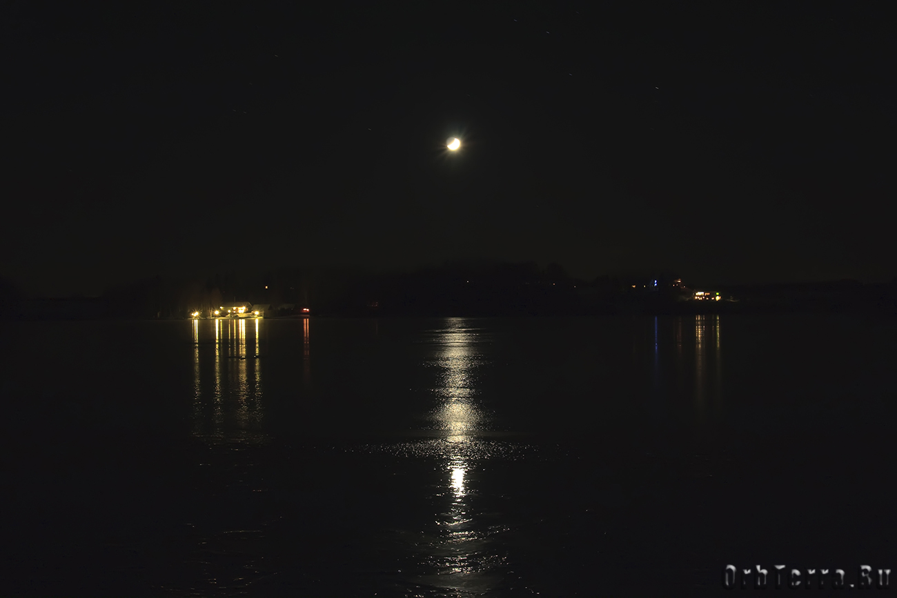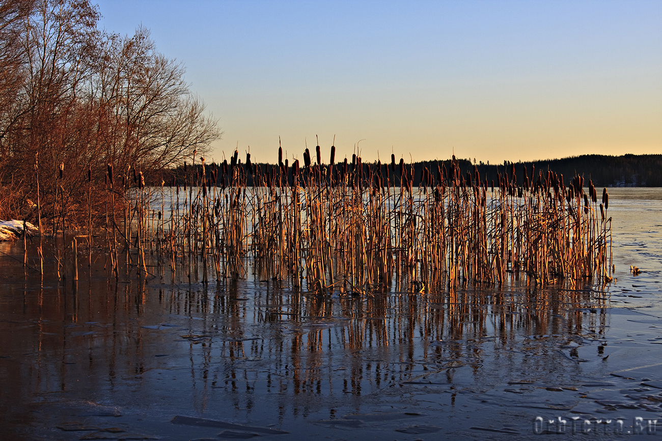 Около двух часов дня идем гулять, на улице -16. Снега конечно маловато, но не замерзшее, как нам казалось, озеро, на самом деле было сковано льдом способным выдержать автомобиль. Просто оно настолько чистое, что не покрытый снегом лед, даже с небольшого расстояния, запросто можно спутать с не замерзшей водой, в которой плавают льдинки. Он настолько прозрачный, что через него как через стекло, можно видеть дно на глубине двух-трех метров. Даже выходить на него страшновато, кажется, что он совсем тонким.