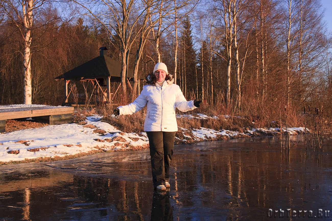 Первый день нового года порадовал нас хорошей зимней погодой, умеренным морозцем и солнечным небом. Неугомонные финны, пока мы за завтраком сонно потягивали чай, уже вовсю носились по льду озера на каких то санях, играли в хоккей, или просто катались на коньках. Люди постарше, шагали по дорожкам с лыжными палками в руках, но без лыж. Говорят, что это очень полезно для позвоночника.