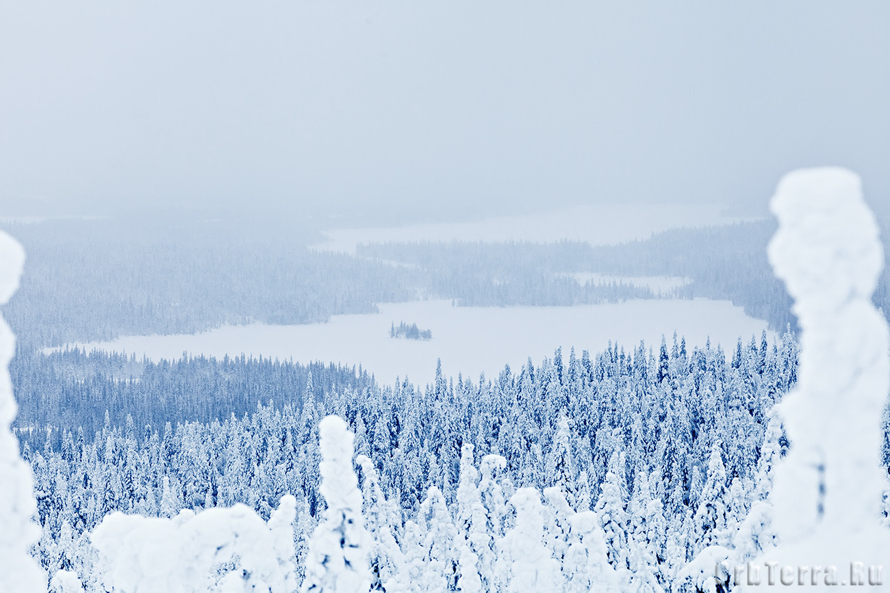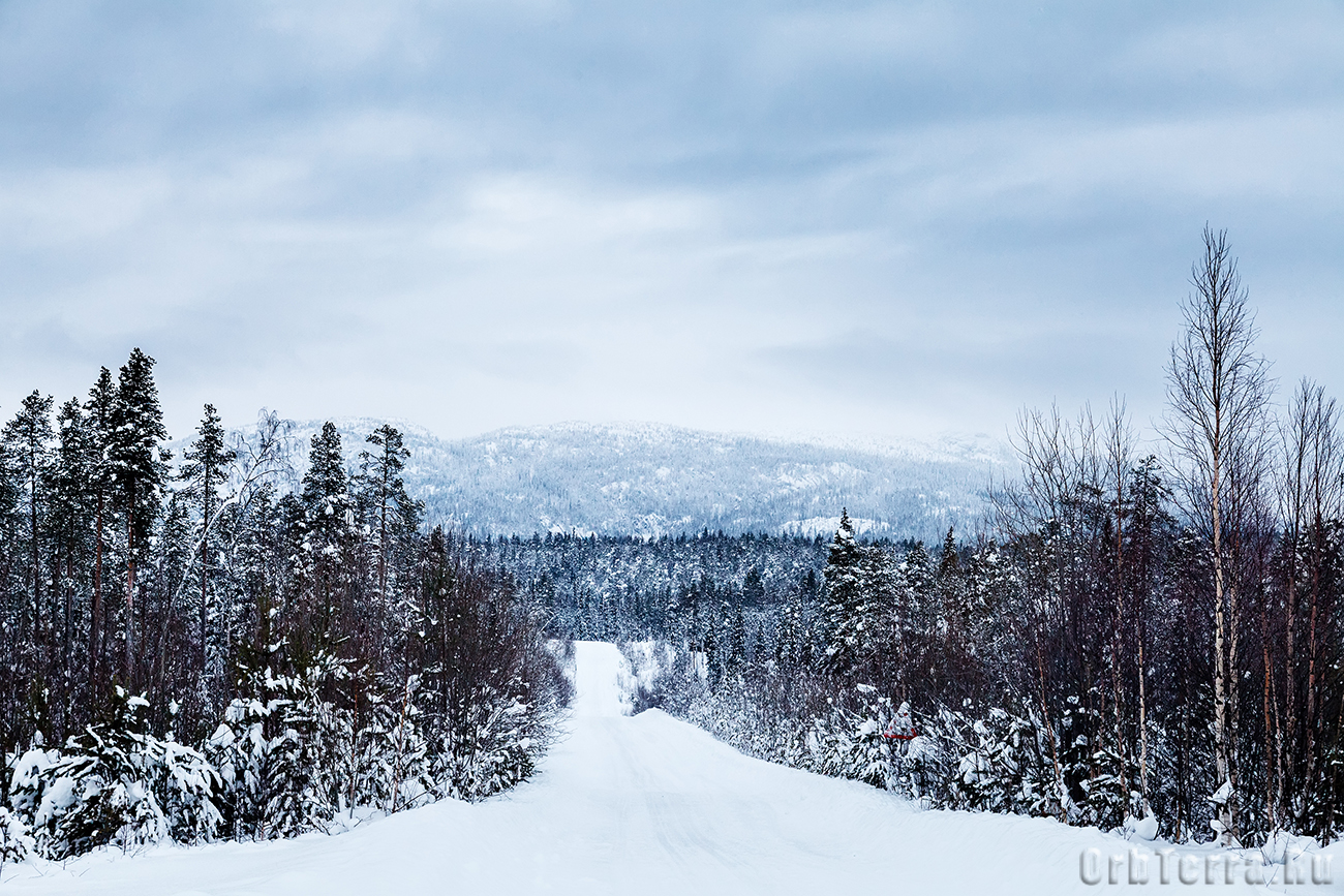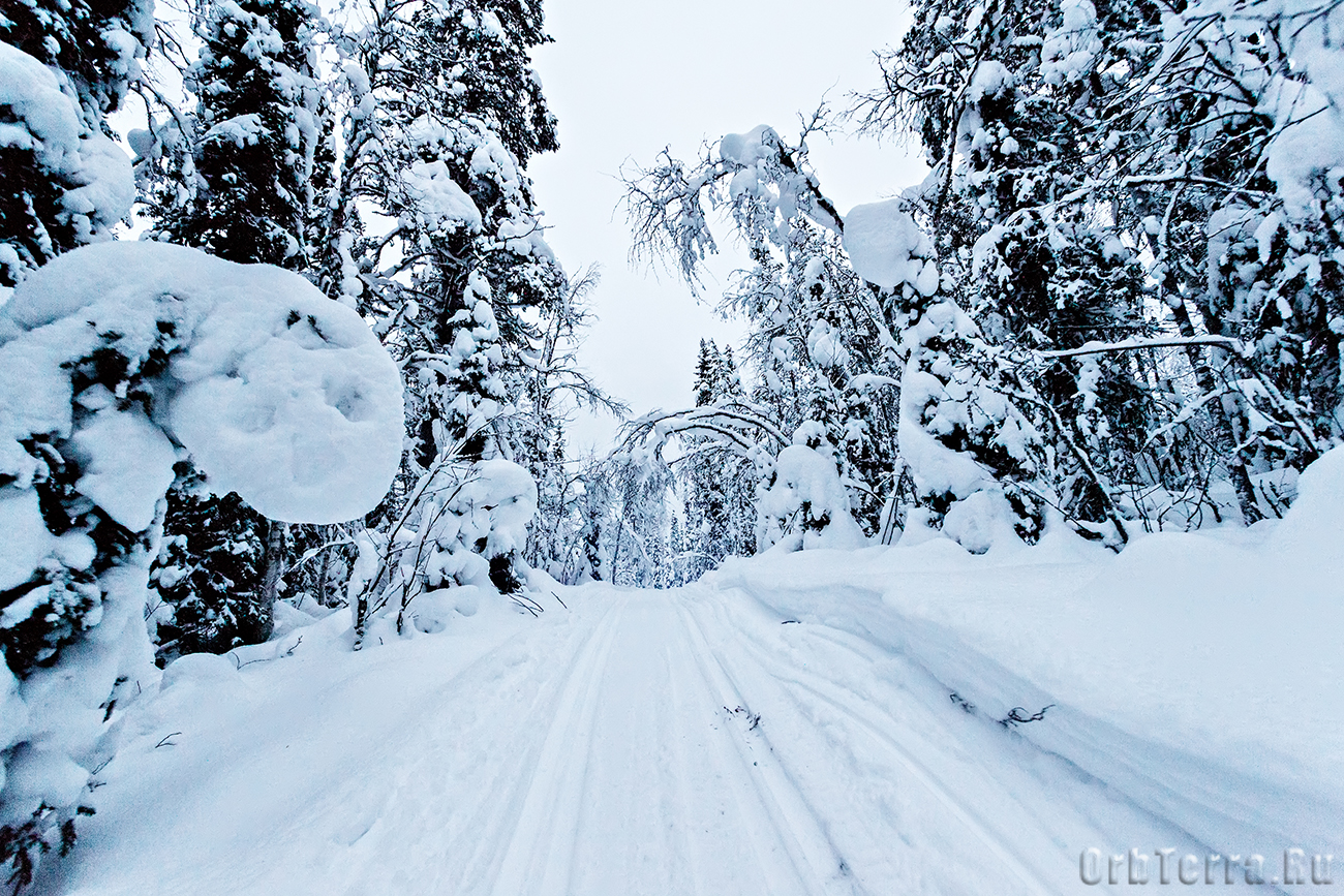 Самая труднодоступная достопримечательность Паанаярви. Маршрут начинается прямо от кордона на въезде в парк. Протяженность зимнего маршрута короче, чем летнего — 18 километров в один конец. Расстояние вполне по плечу лыжнику- любителю, но мы предпочли снегоход и санки. Как я уже писал выше, передвижение на санках комфортным не назовешь, но мы вытащили из машины все пледы и смогли более-менее устроиться.