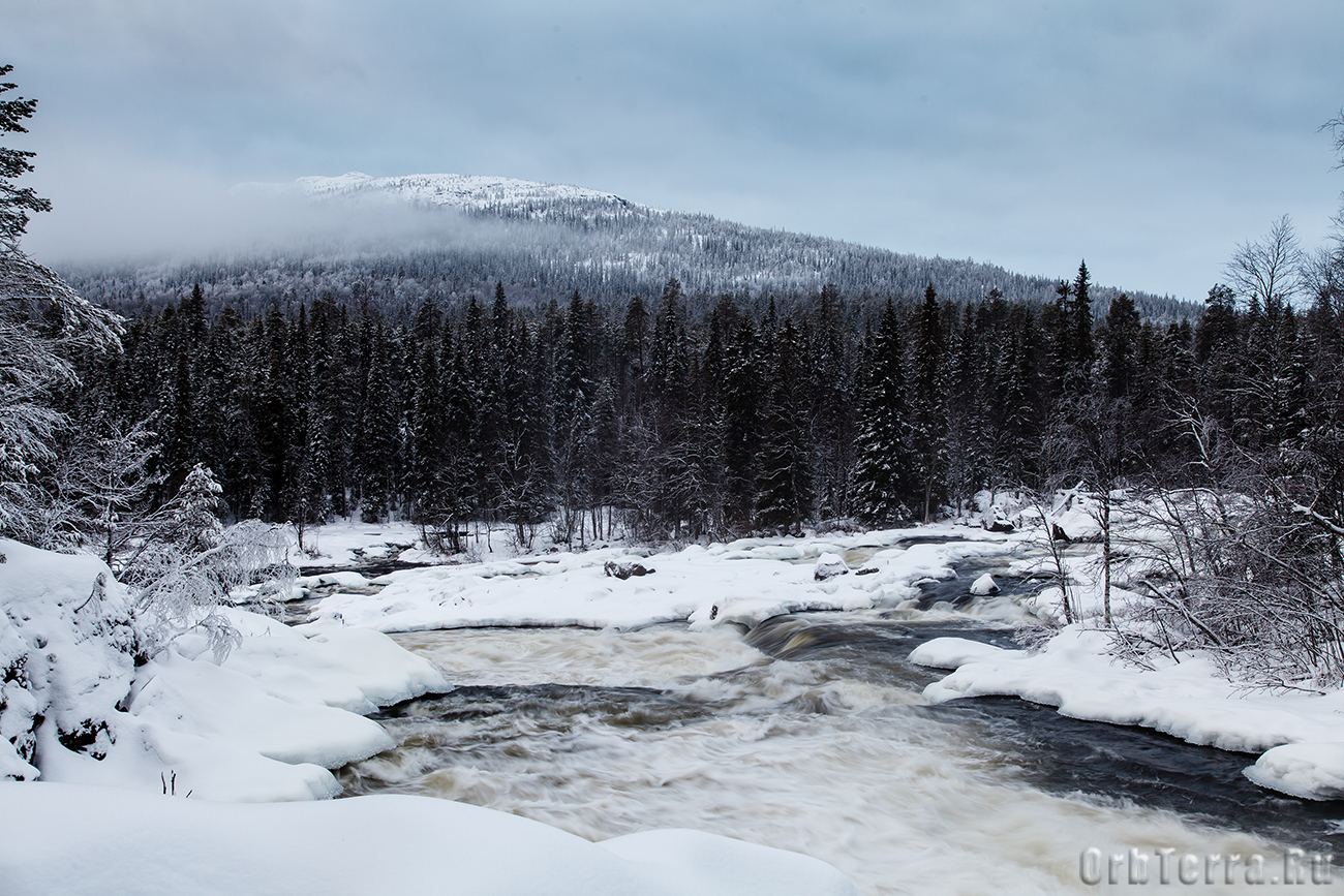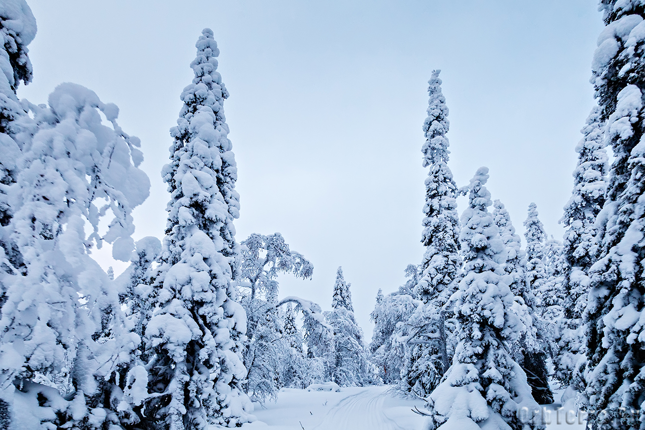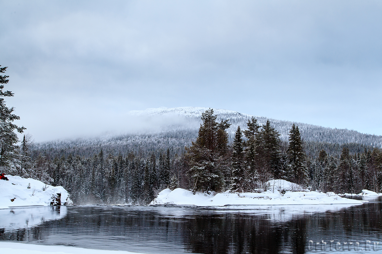 Самая труднодоступная достопримечательность Паанаярви. Маршрут начинается прямо от кордона на въезде в парк. Протяженность зимнего маршрута короче, чем летнего — 18 километров в один конец. Расстояние вполне по плечу лыжнику- любителю, но мы предпочли снегоход и санки. Как я уже писал выше, передвижение на санках комфортным не назовешь, но мы вытащили из машины все пледы и смогли более-менее устроиться.