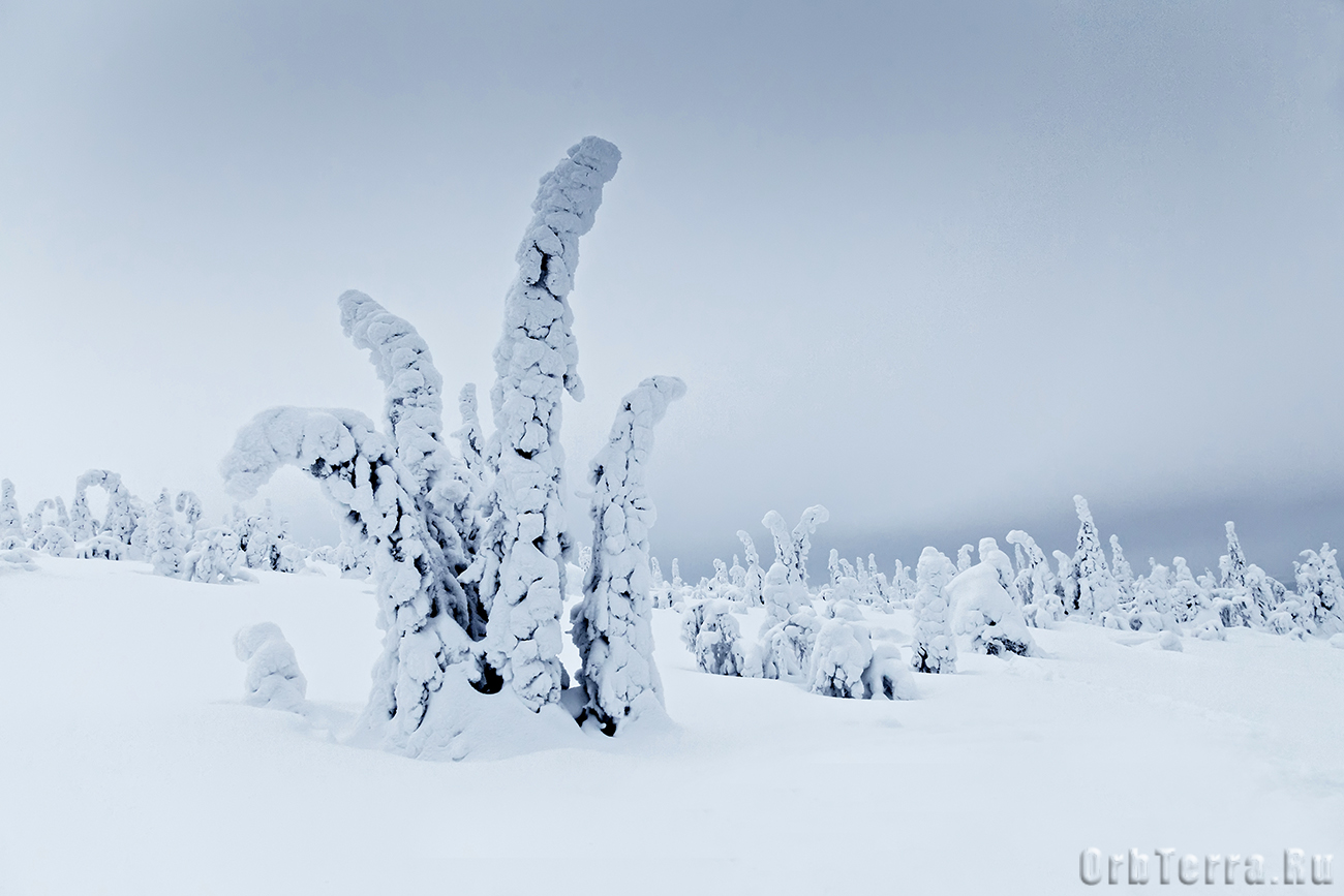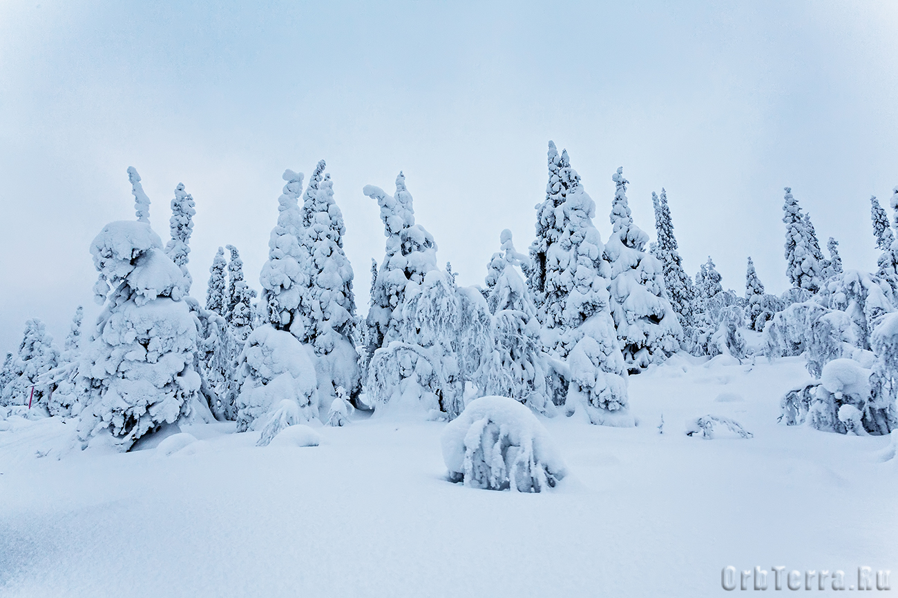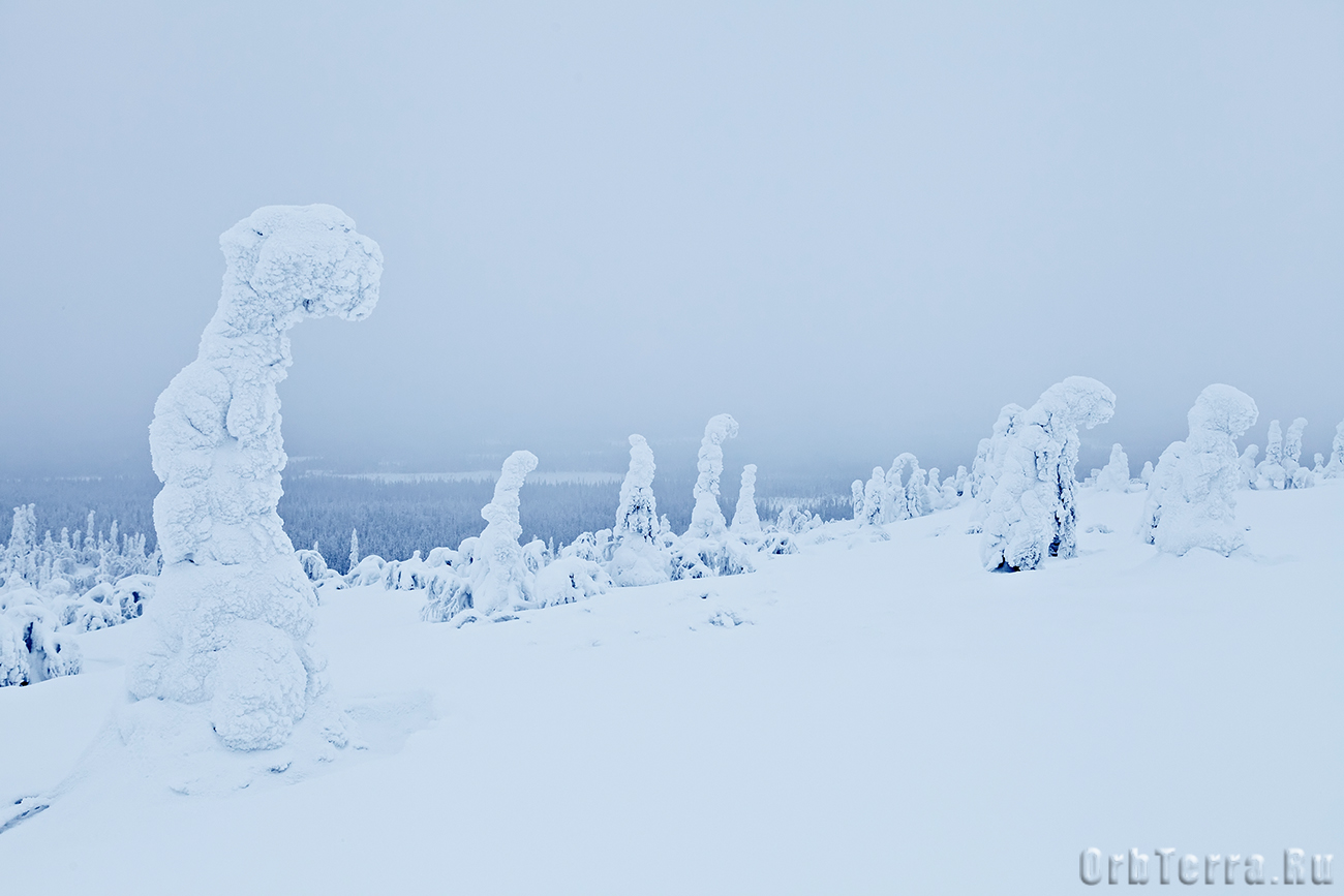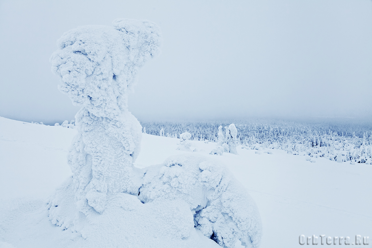 С первых метров маршрута начинается мир безмолвной белой сказки. Огромные заснеженные ели сменяются белыми полями болот и озер. В снегу можно увидеть множество следов птиц и зверей. Один из которых наш проводник определил, как след росомахи. А склоны горы снег и ветер украсили фантастическими скульптурами сказочных существ.