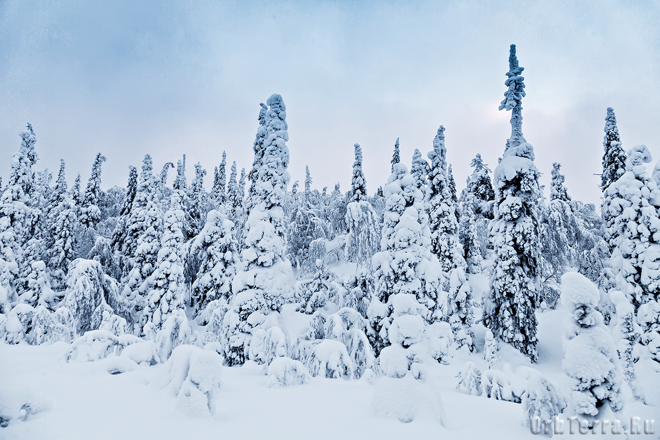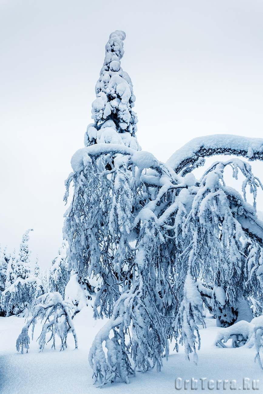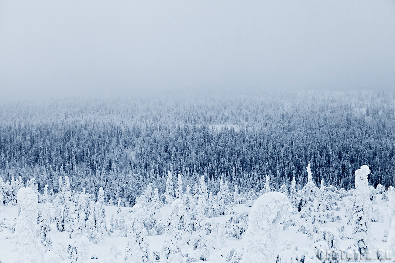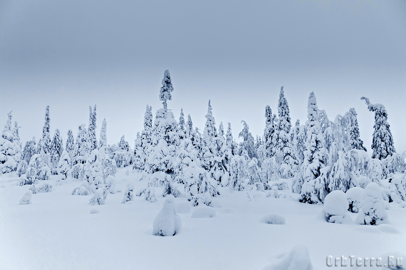 С первых метров маршрута начинается мир безмолвной белой сказки. Огромные заснеженные ели сменяются белыми полями болот и озер. В снегу можно увидеть множество следов птиц и зверей. Один из которых наш проводник определил, как след росомахи. А склоны горы снег и ветер украсили фантастическими скульптурами сказочных существ.