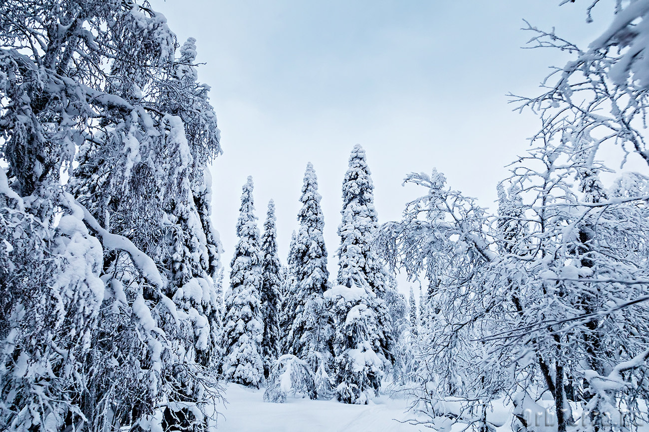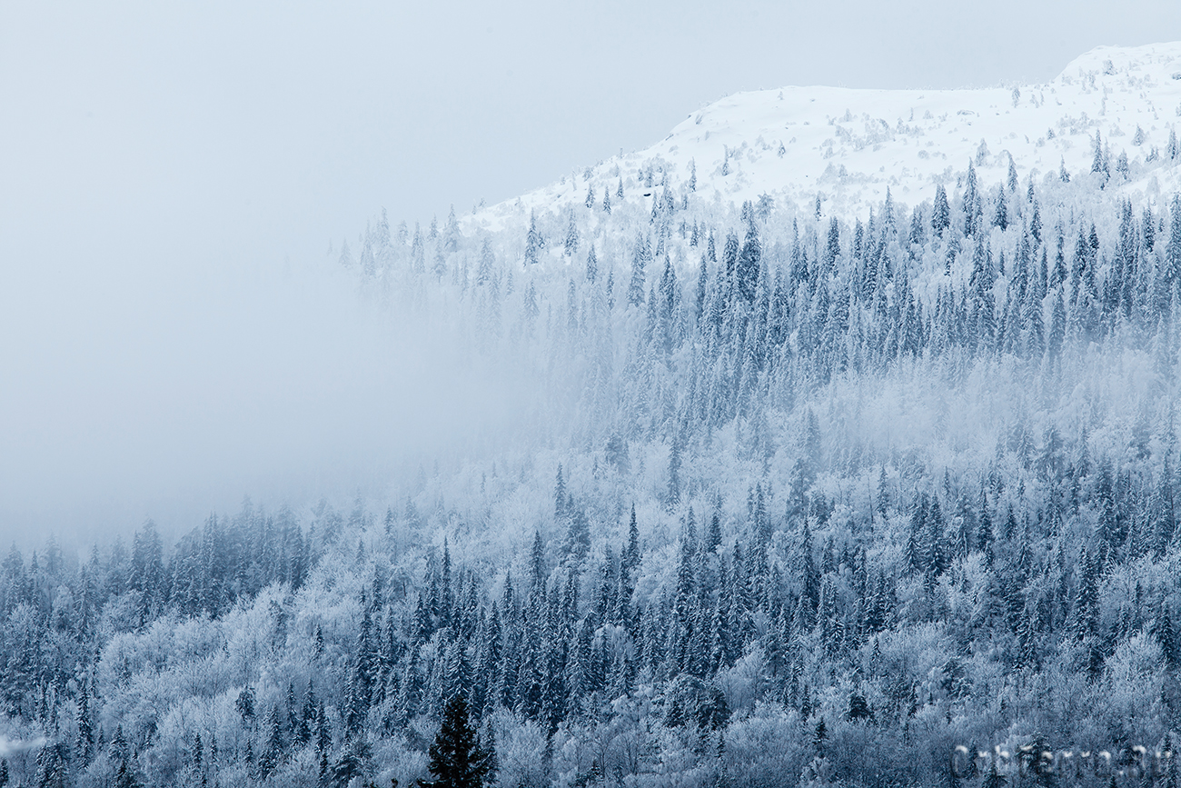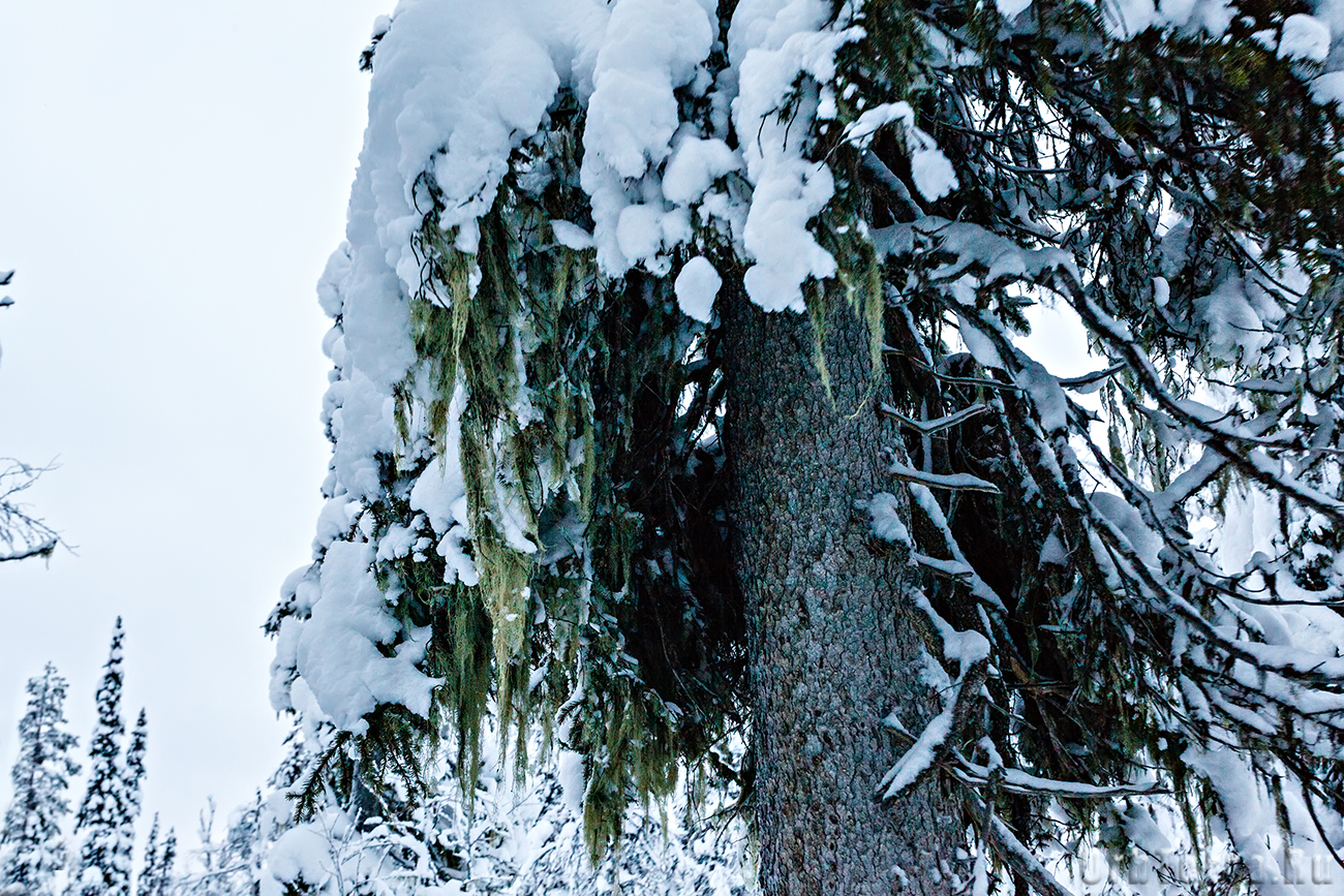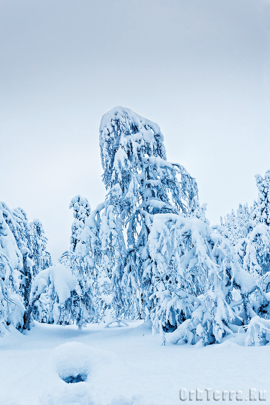 С первых метров маршрута начинается мир безмолвной белой сказки. Огромные заснеженные ели сменяются белыми полями болот и озер. В снегу можно увидеть множество следов птиц и зверей. Один из которых наш проводник определил, как след росомахи. А склоны горы снег и ветер украсили фантастическими скульптурами сказочных существ.