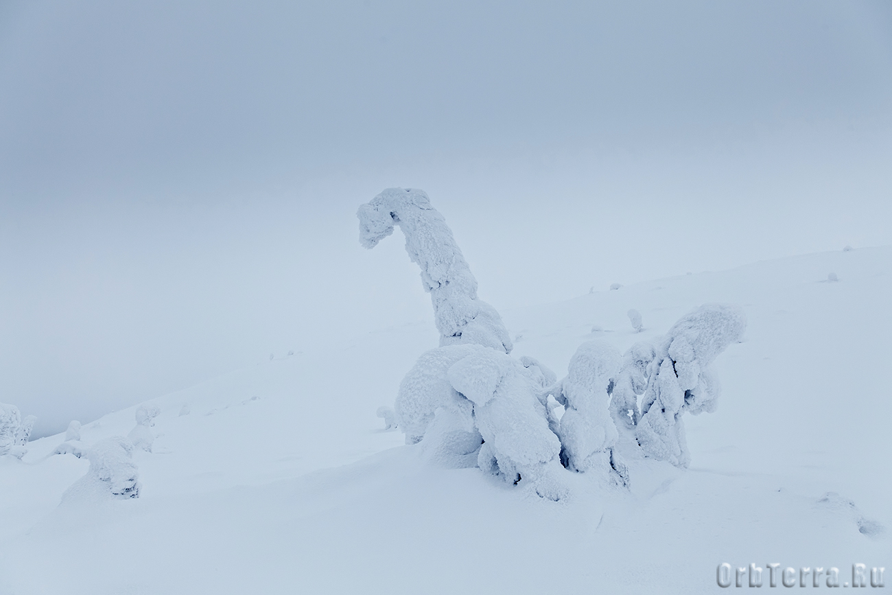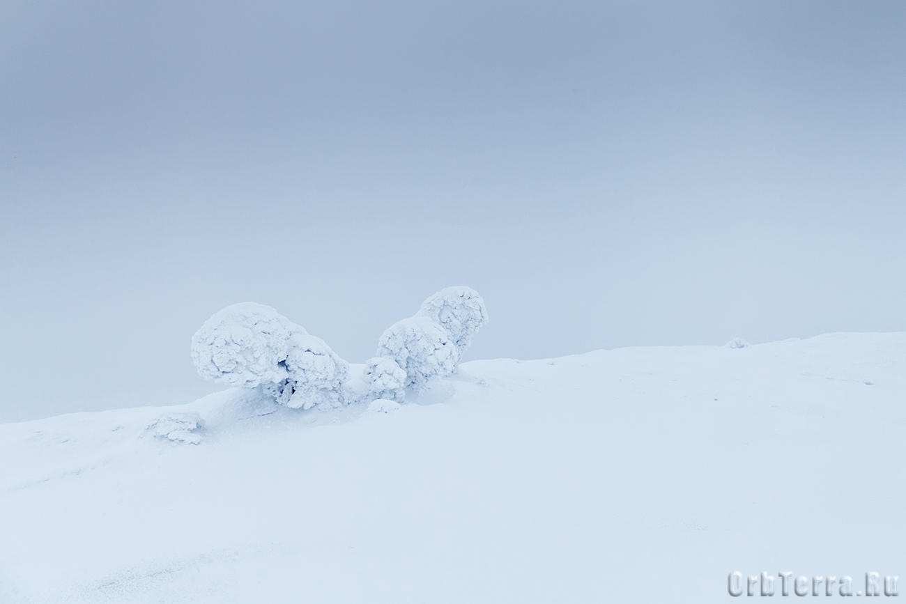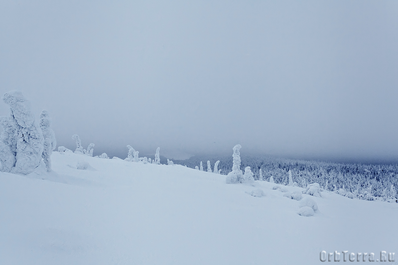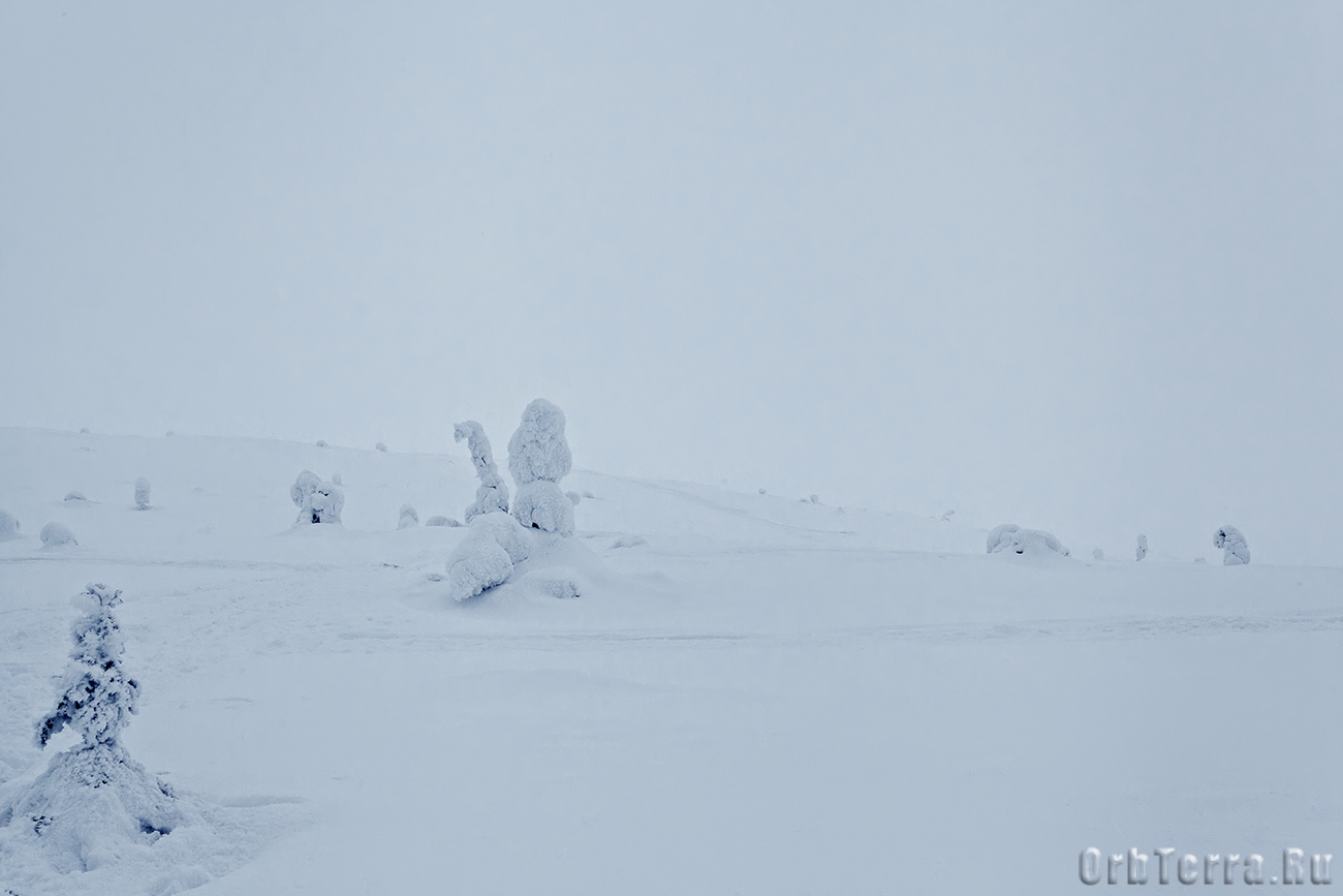 По мере подъёма и смены высотных поясов (таёжного, лесотундрового и тундрового), деревьев становиться все меньше и меньше, и вершина горы предстает в виде снежной пустоши, без каких либо ориентиров. В хорошую погоду с вершины горы открывается обширная панорама, но в нашем случае была низкая облачность, и вершина тонула в серых облаках. Стояла на удивление тихая, безветренная погода, и рассчитывать, что вершина очистится от облаков не приходилось. Снимать на вершине не было никакой возможности, поэтому все снимки сделаны со склона горы, метров на 50-70 ниже вершины.