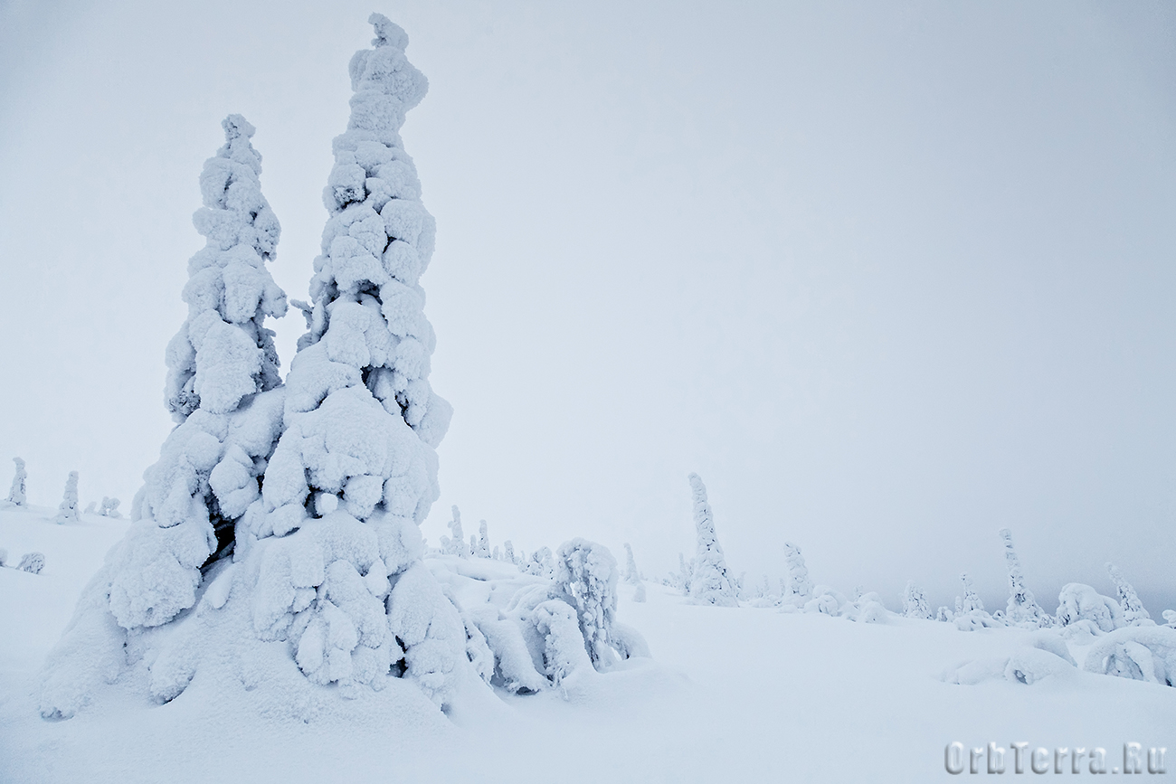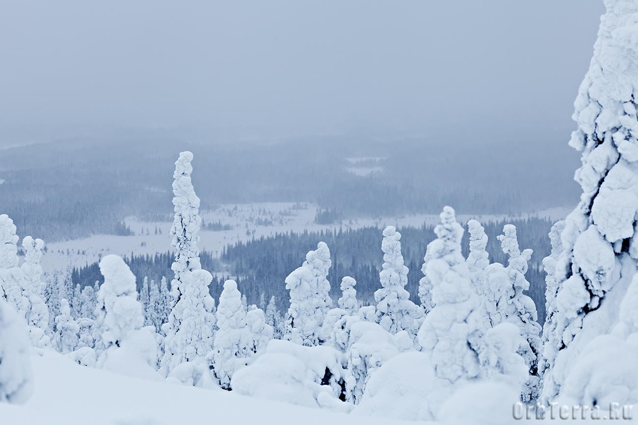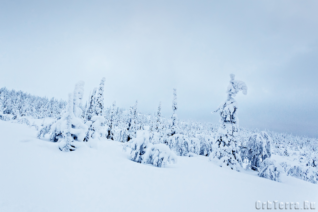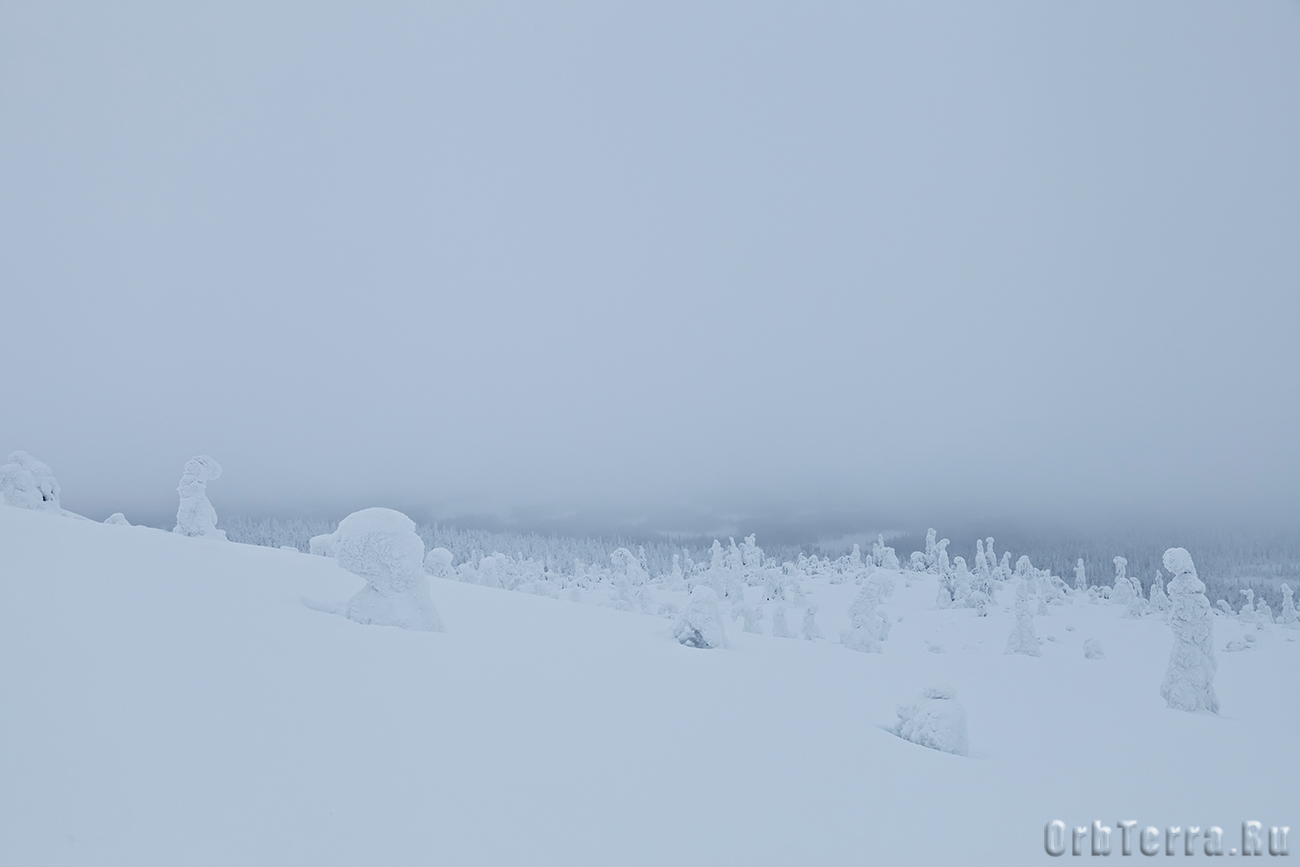 По мере подъёма и смены высотных поясов (таёжного, лесотундрового и тундрового), деревьев становиться все меньше и меньше, и вершина горы предстает в виде снежной пустоши, без каких либо ориентиров. В хорошую погоду с вершины горы открывается обширная панорама, но в нашем случае была низкая облачность, и вершина тонула в серых облаках. Стояла на удивление тихая, безветренная погода, и рассчитывать, что вершина очистится от облаков не приходилось. Снимать на вершине не было никакой возможности, поэтому все снимки сделаны со склона горы, метров на 50-70 ниже вершины.