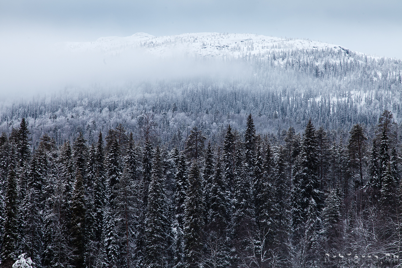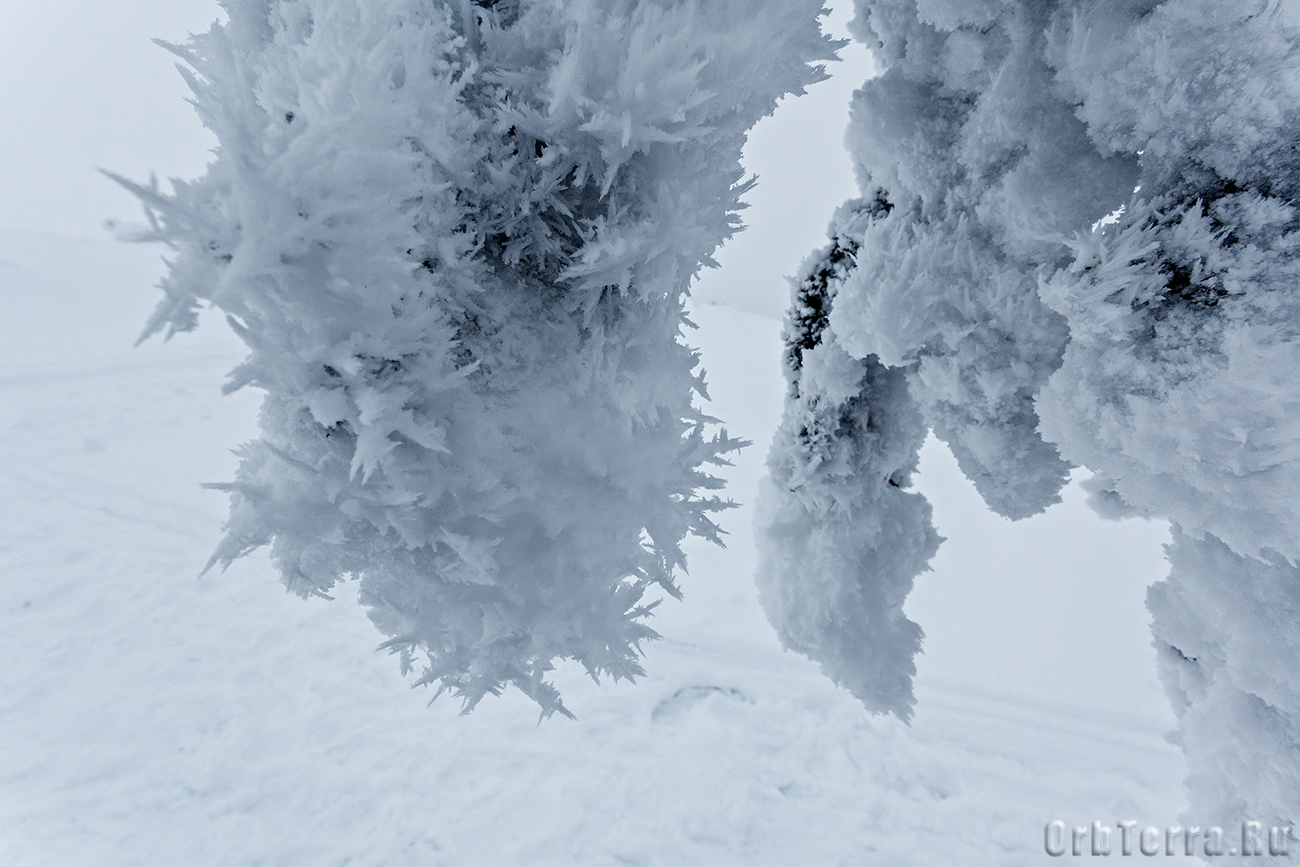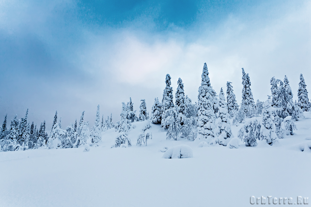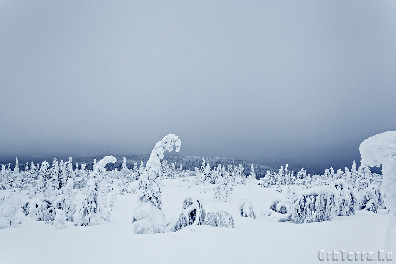По мере подъёма и смены высотных поясов (таёжного, лесотундрового и тундрового), деревьев становиться все меньше и меньше, и вершина горы предстает в виде снежной пустоши, без каких либо ориентиров. В хорошую погоду с вершины горы открывается обширная панорама, но в нашем случае была низкая облачность, и вершина тонула в серых облаках. Стояла на удивление тихая, безветренная погода, и рассчитывать, что вершина очистится от облаков не приходилось. Снимать на вершине не было никакой возможности, поэтому все снимки сделаны со склона горы, метров на 50-70 ниже вершины.