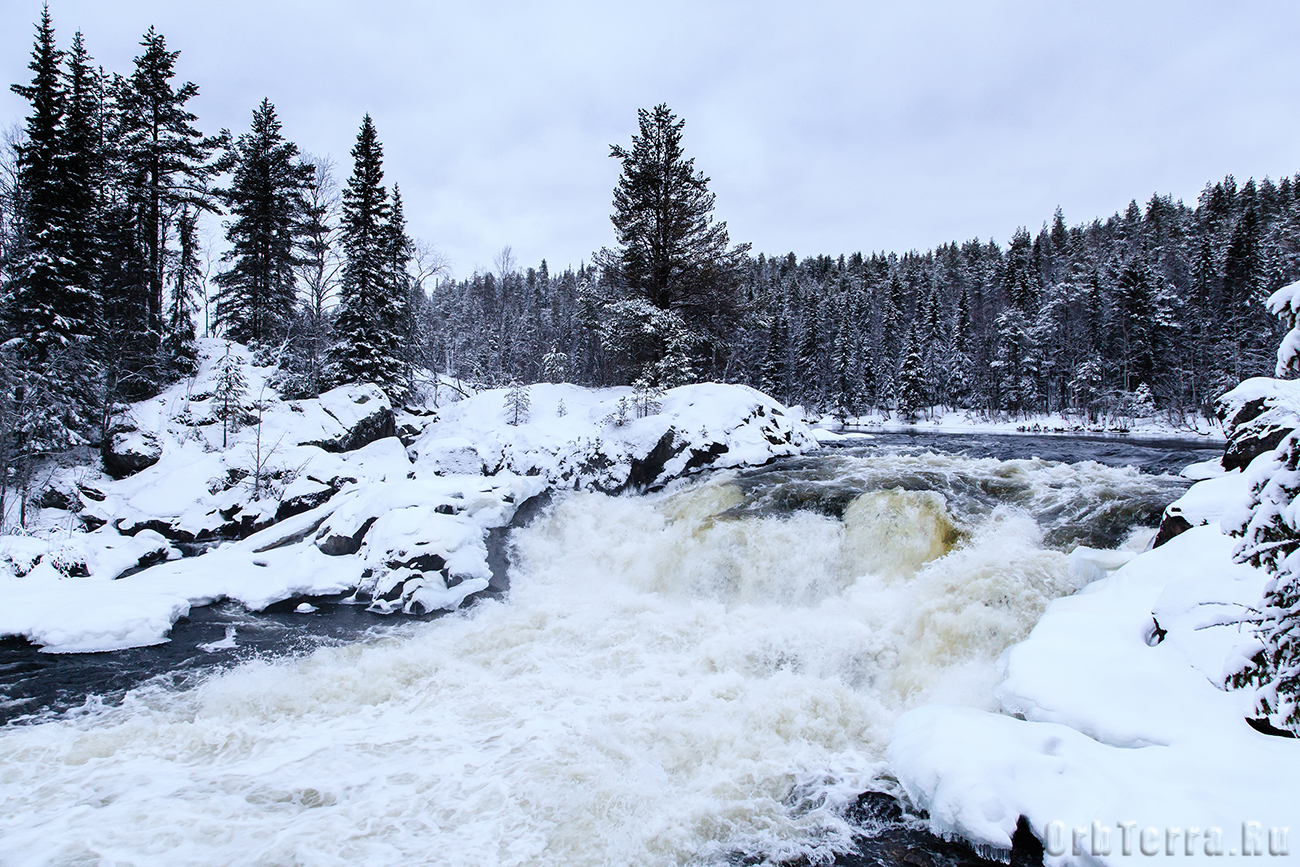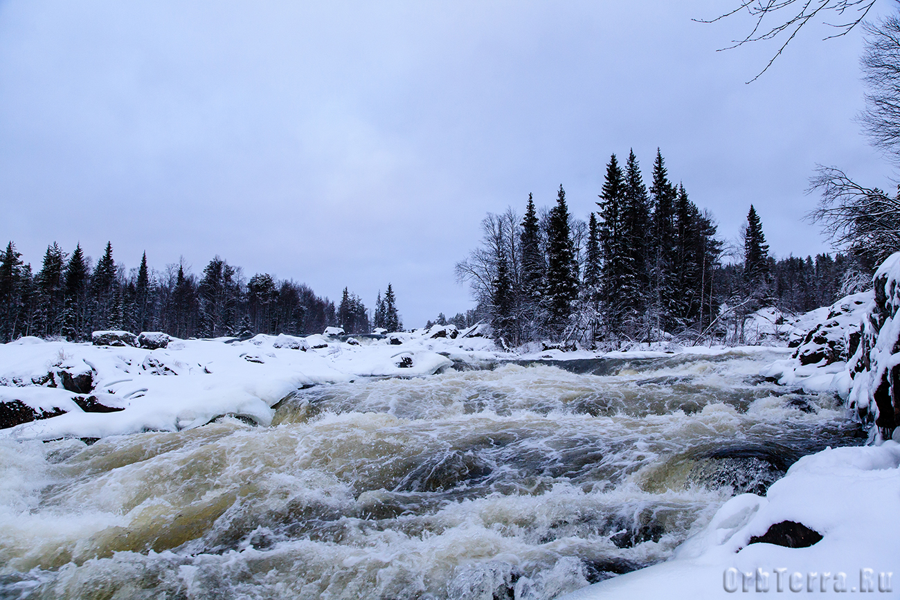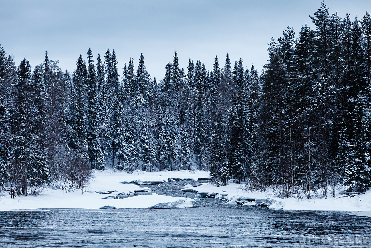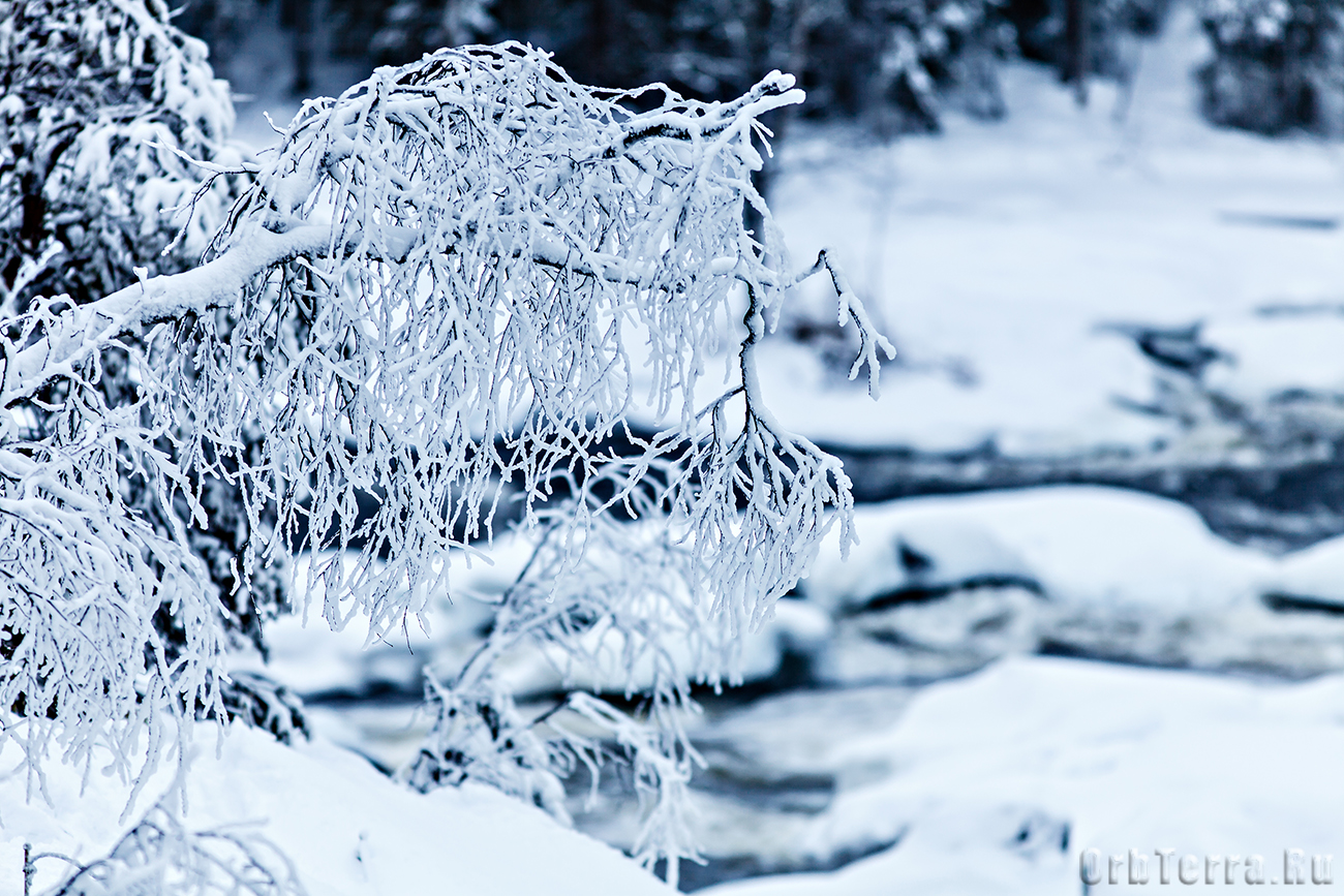 Зимой Киваккакоски впечатляет не меньше чем летом. В любой мороз с грохотом низвергаются десятки тонн воды, и несутся по уступам вниз, взбивая мириады брызг, тутже застывающих ледяным кружевом на камнях и ветках деревьев. И все это на фоне седой от снега громады горы Кивакка. Смотреть можно до бесконечности, забыв про все на свете.