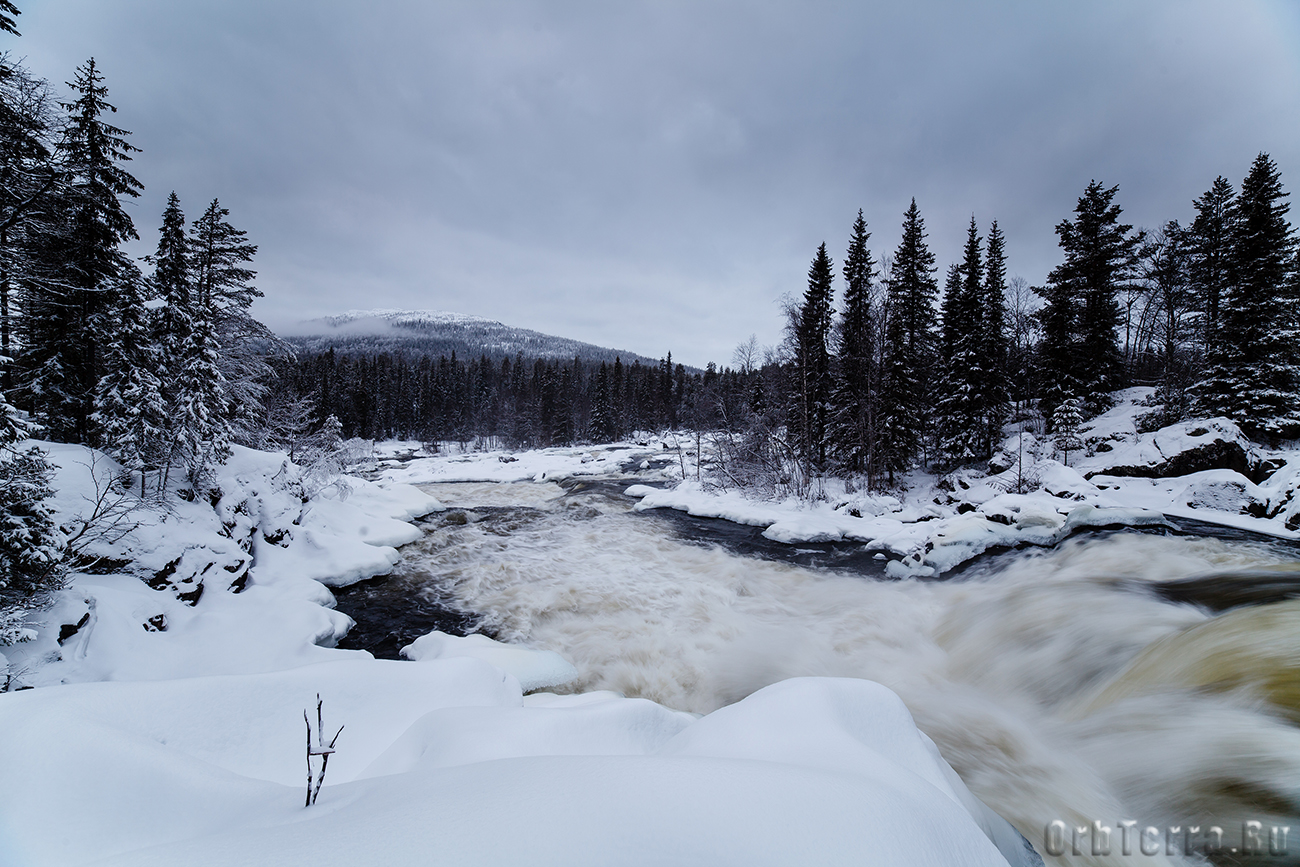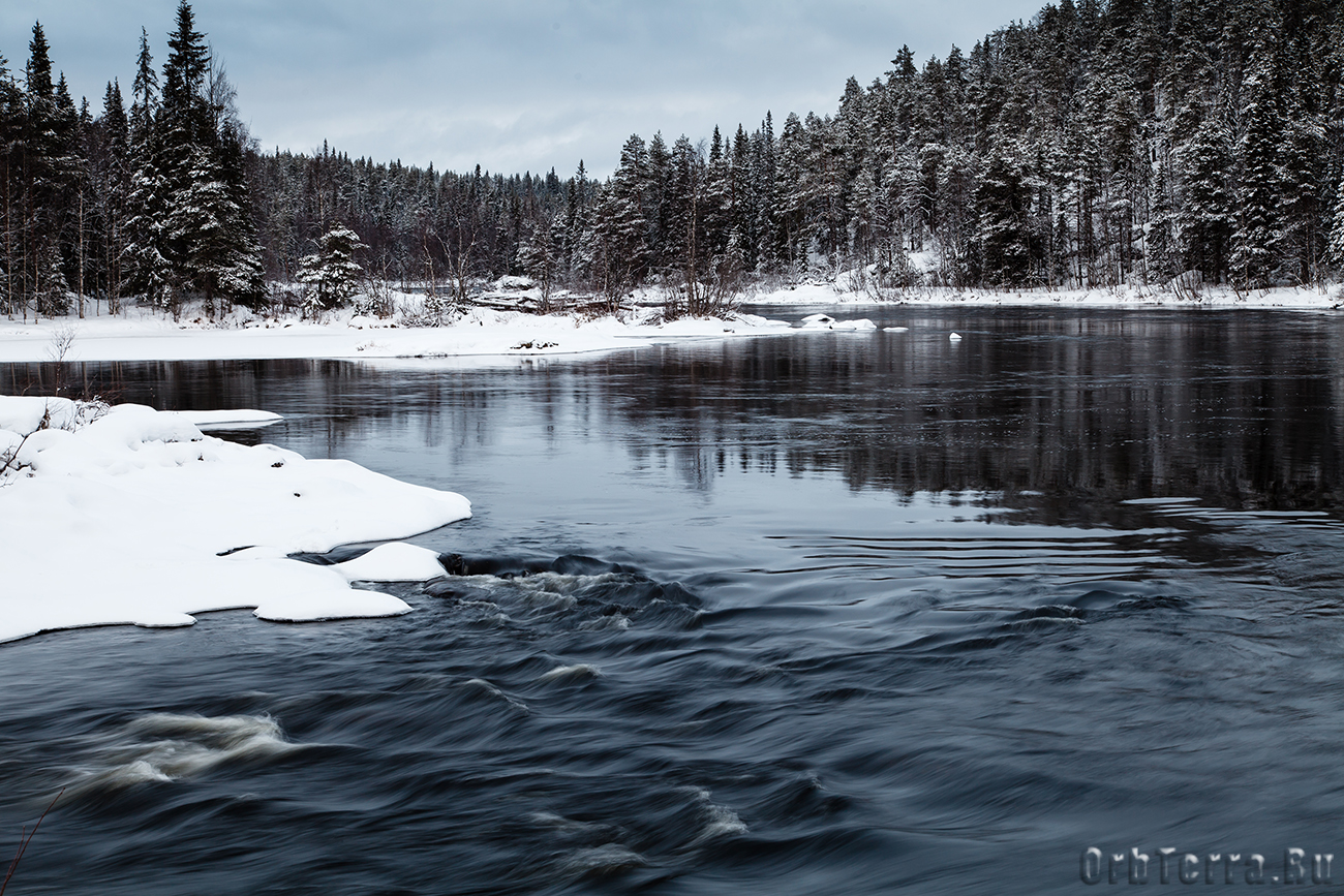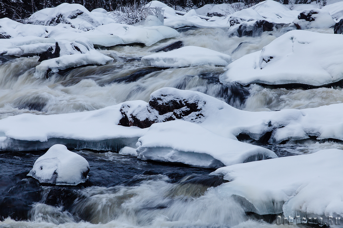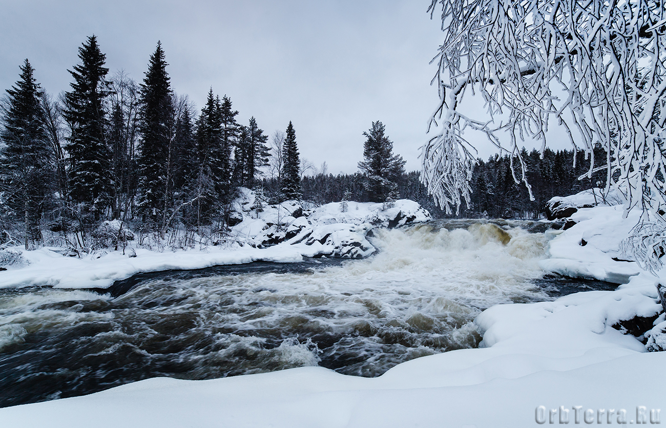 Зимой Киваккакоски впечатляет не меньше чем летом. В любой мороз с грохотом низвергаются десятки тонн воды, и несутся по уступам вниз, взбивая мириады брызг, тутже застывающих ледяным кружевом на камнях и ветках деревьев. И все это на фоне седой от снега громады горы Кивакка. Смотреть можно до бесконечности, забыв про все на свете.