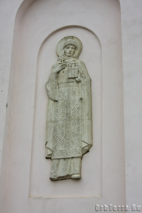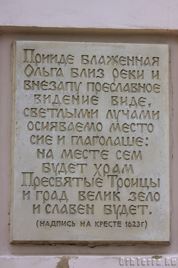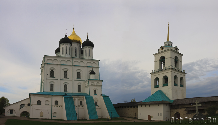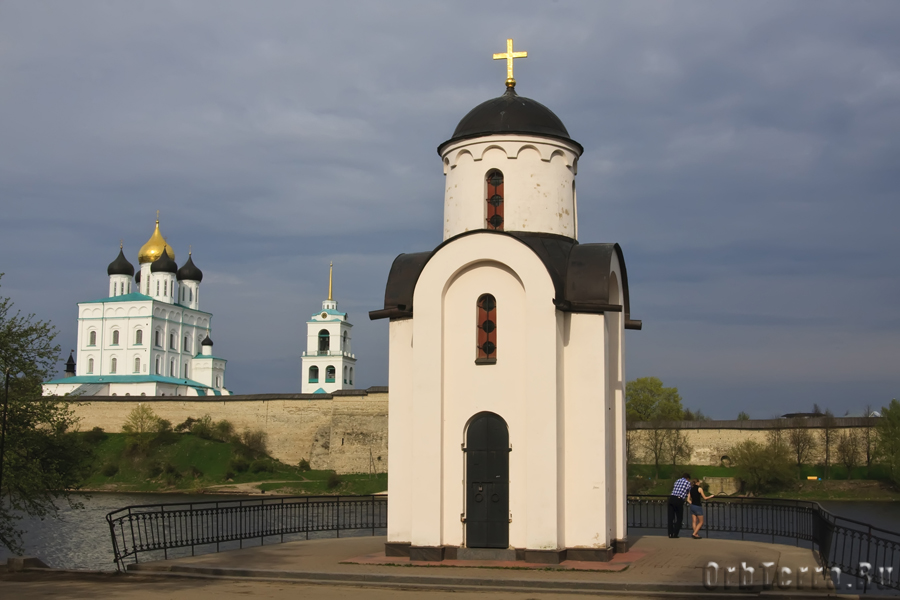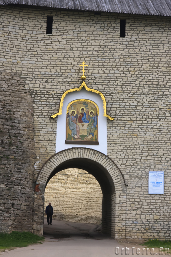 Псковский Кром впечатляет, мощные стены, башни и белокаменная громада Троицкого собора, отражающаяся в реке Великой. Особенно красивая панорама Крома и городских укреплений Пскова открывается из Завеличья (на фото в начале статьи), со смотровой площадки у часовни святой равноапостольной княгини Ольги, с которой ее лик взирает на основанный ей город.. А какая история! Летописи ведутся регулярно аж с XIV века. Жаль времени на осмотр немного осталось.