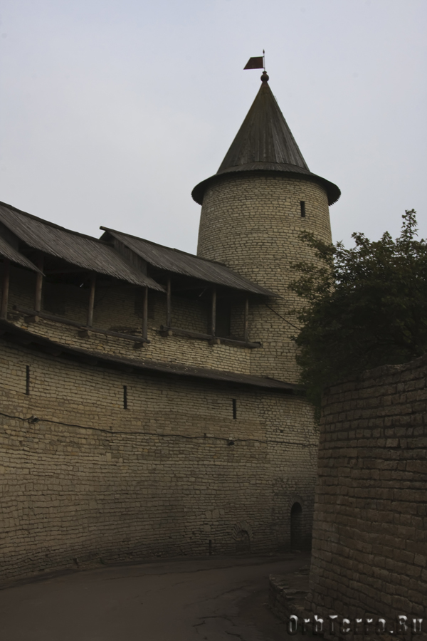 Восточная стена протяжённостью 435 метров и западная – 345 метров, имеют высоту от 6 до 8 метров и толщину 2,5 метра, боевые ходы перекрыты деревянной кровлей. Приступ к ним защищен реками Великой и Псковой.