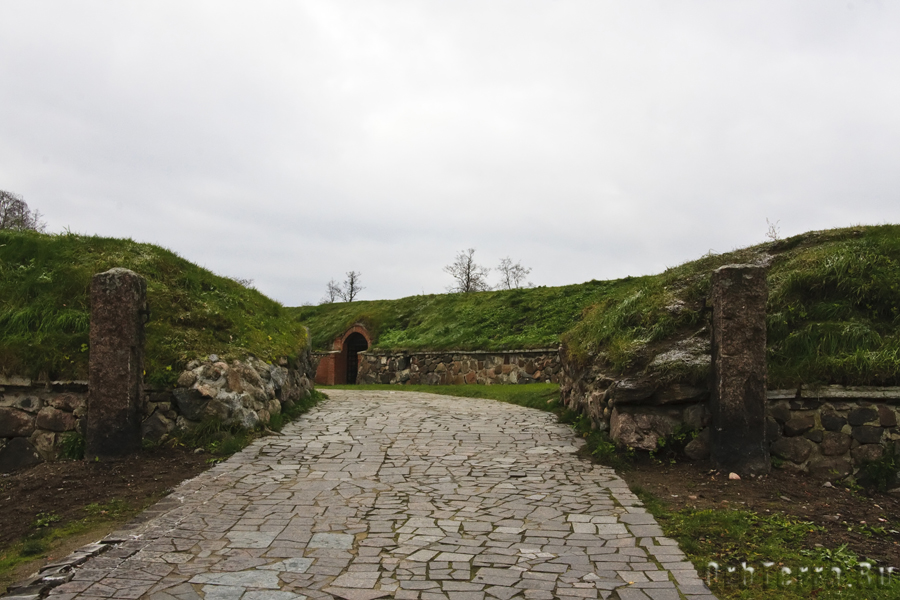 С дороги крепость видно не слишком хорошо, поэтому в качестве ориентира удобно использовать танк и самоходную артиллерийскую установку установленные слева от дороги (если ехать из Питера). Там же можно и запарковать машины.