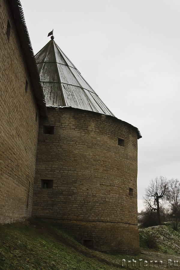 Между Клементовской и Раскатной башнями можно увидеть фрагмент стены из плит, уложенных насухо. Она относится к крепости посадника Павла, т.е. к 1114 году.